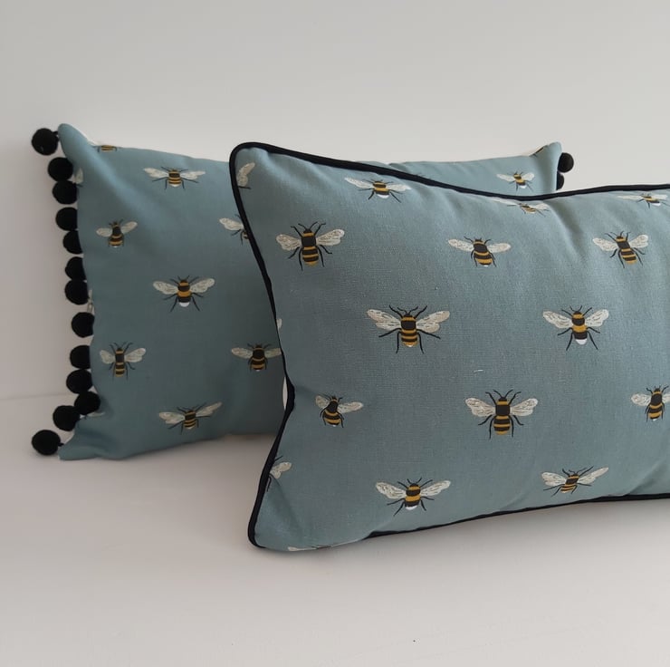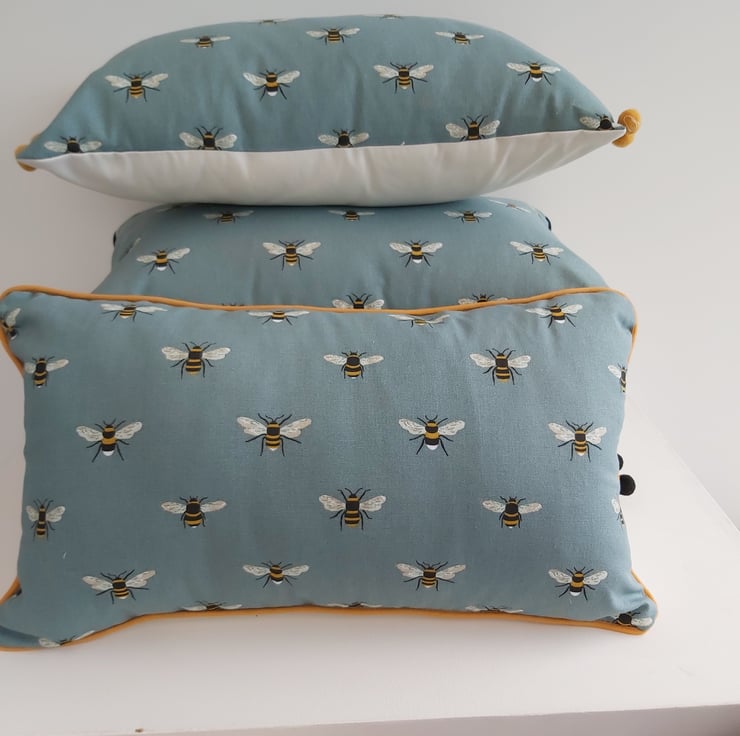 Sophie Allport bees fabric cushion with cream back and central zip and mustard piping.