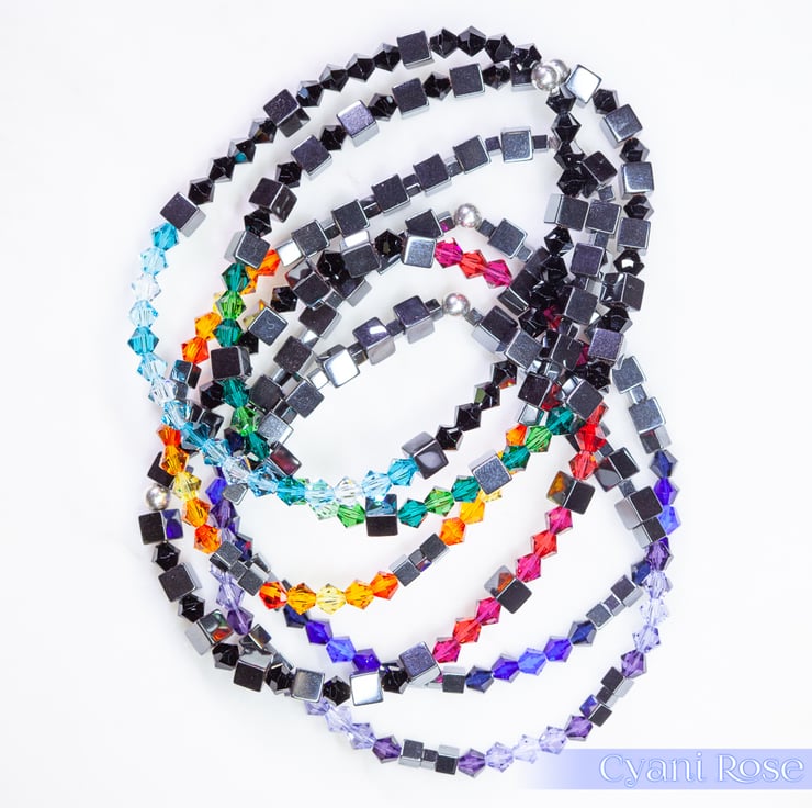 The bright sparkly swarovski colours blend really nicely with the black hematite. It creates a sci-fi/futuristic style of jewellery.