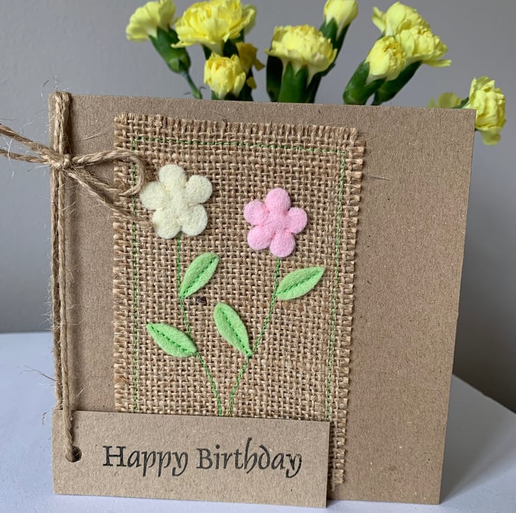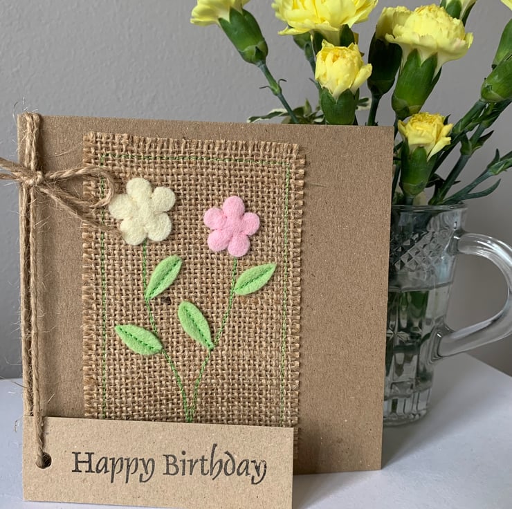 This card is decorated with pale pink and cream flowers hand cut from 100% wool felt. They are then hand and machine sewn onto a hessian background.