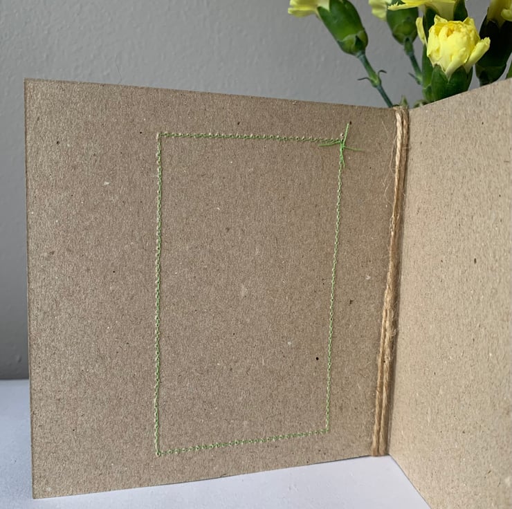 The hessian is machine stitched using a contrasting thread, onto a plain brown recycled card card. This stitching is visible on the inside of the card.