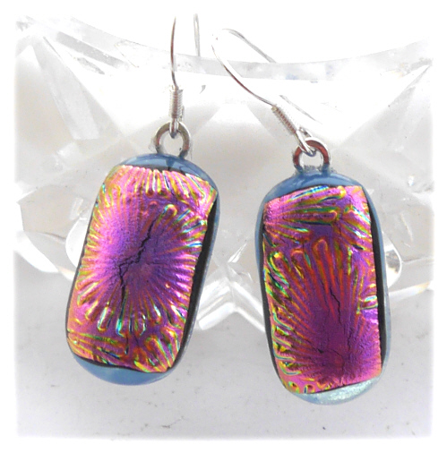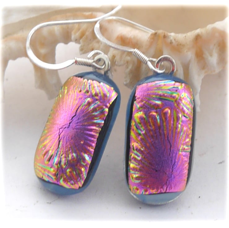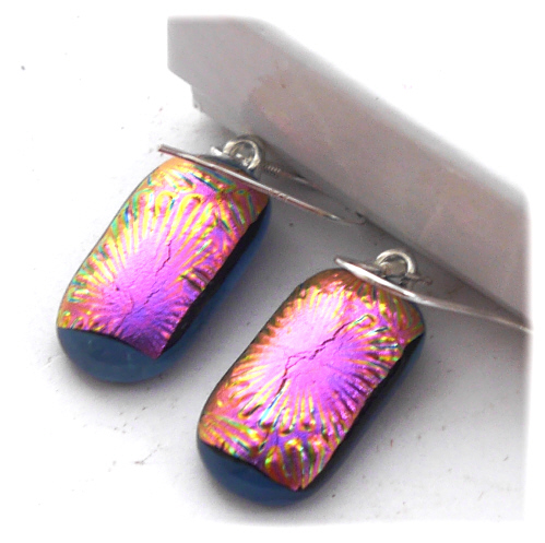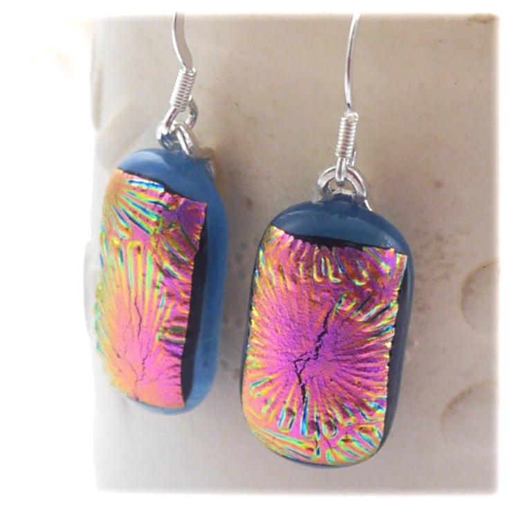 I've taken several photos of the earrings to try to show you the top colour which changes in the light. this is a feature of wonderful dichroic glass. The base glass is opaque denim blue.