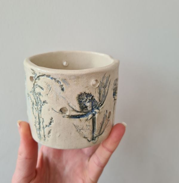Real flowers have been pressed into the surface of the clay, leaving behind their beautiful floral skeletons which have been highlighted in a teal green glaze.