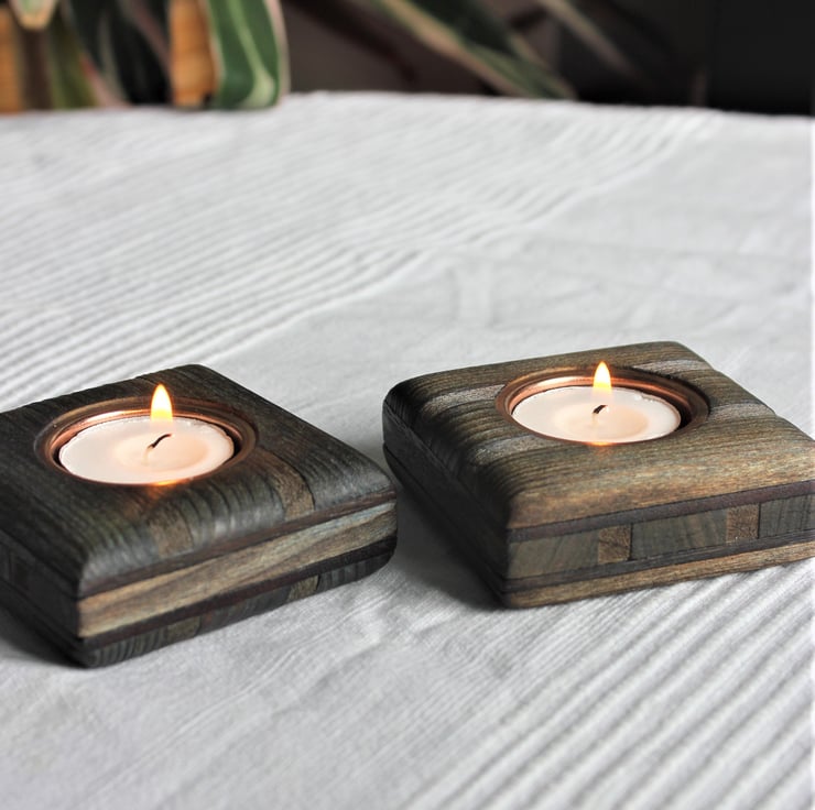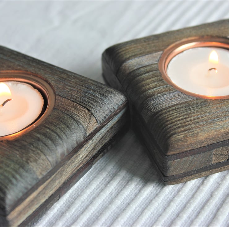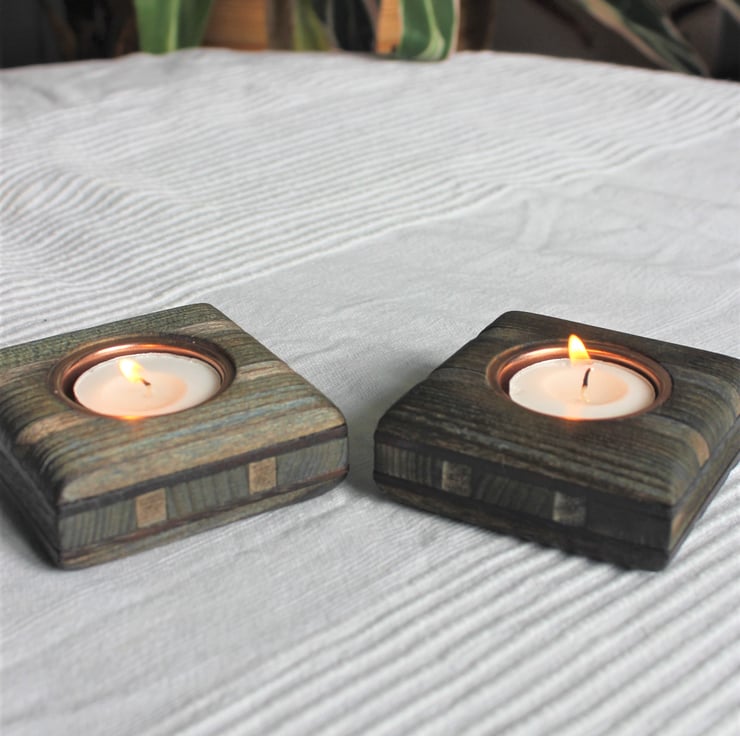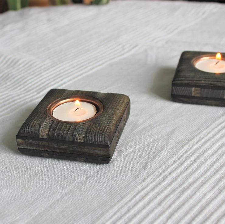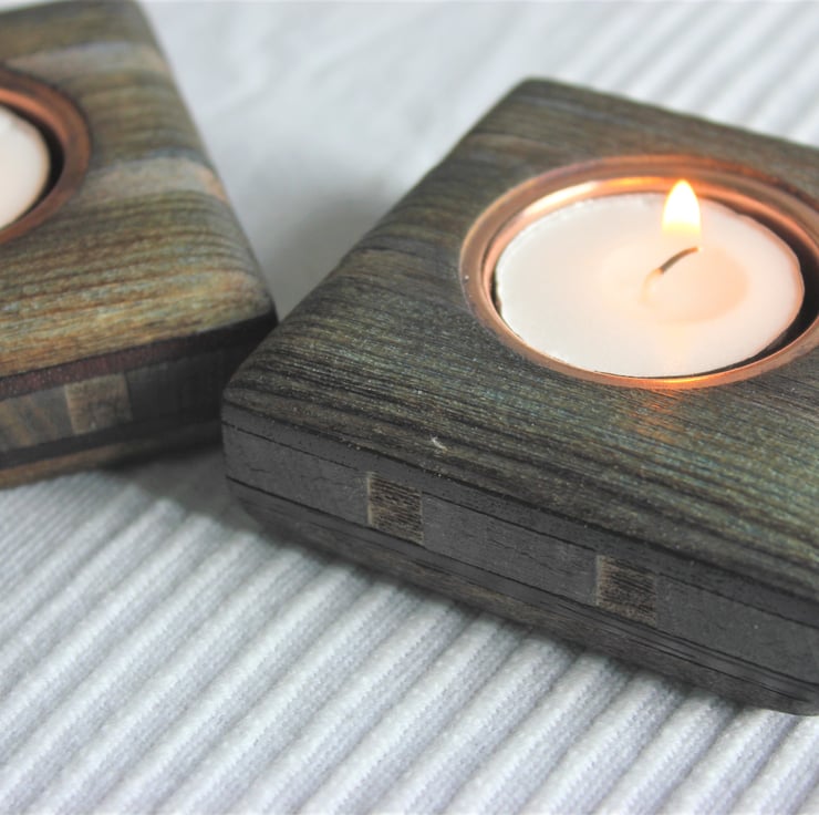 This is an traditional Japanese technique of burning and charring wood. Mainly for protection for wood exteriors like fences or gates etc. It has gone to a whole different level, where it has been foted wood tea light holders. Made from off cuts of poplar and Sapele. Made to a flat base with rounded top and bottom edge. copper metal tealight holder insert.