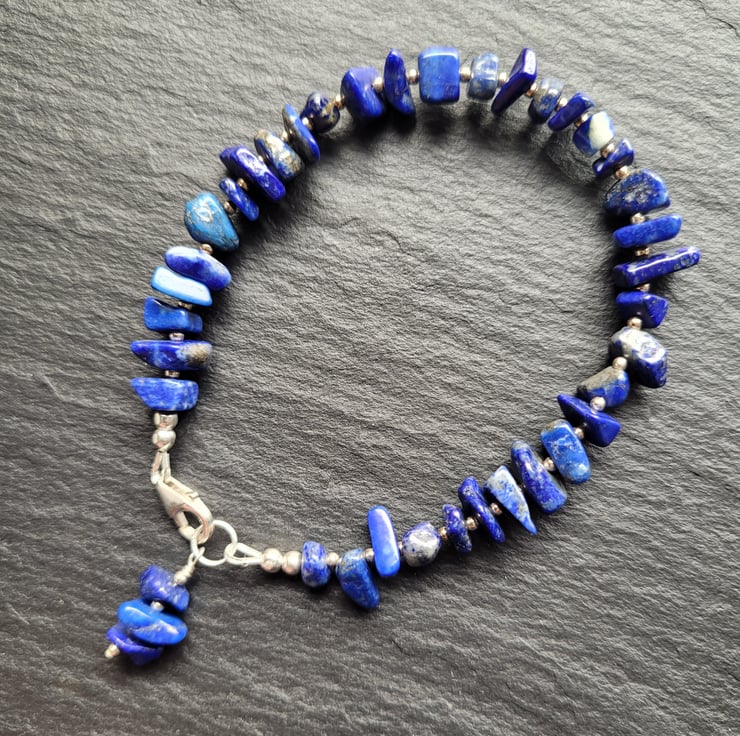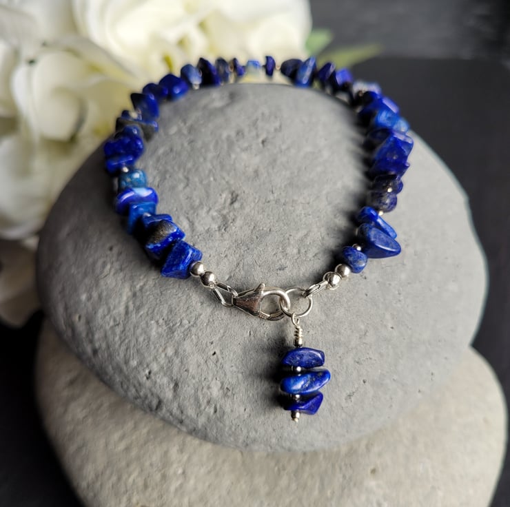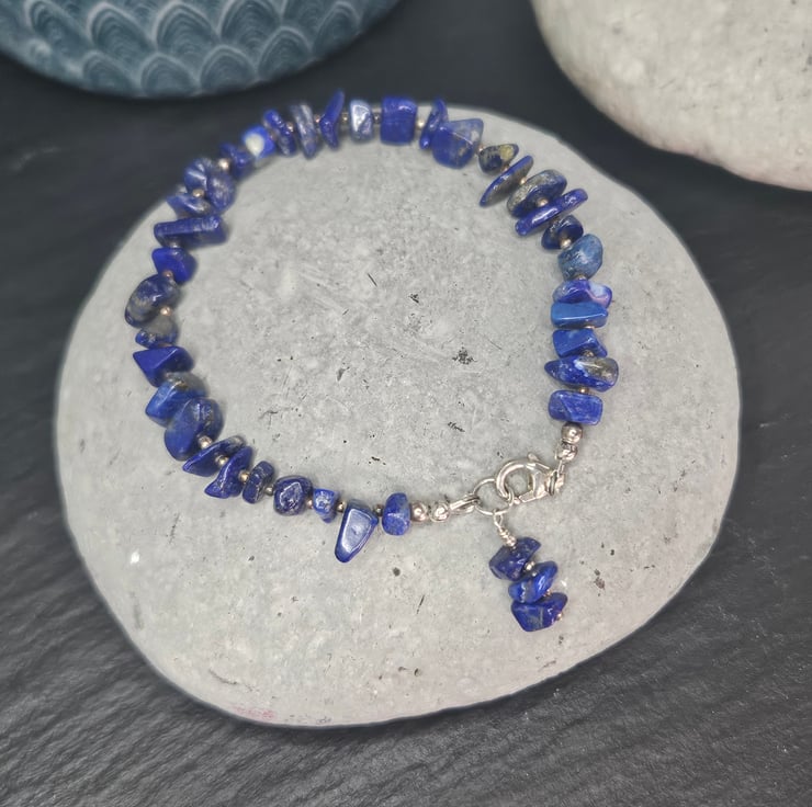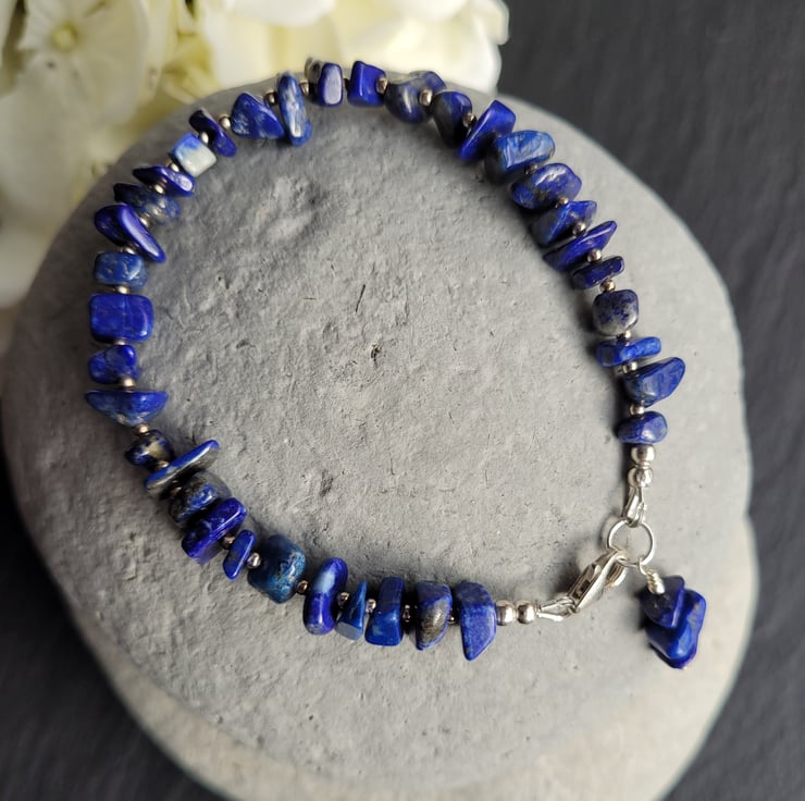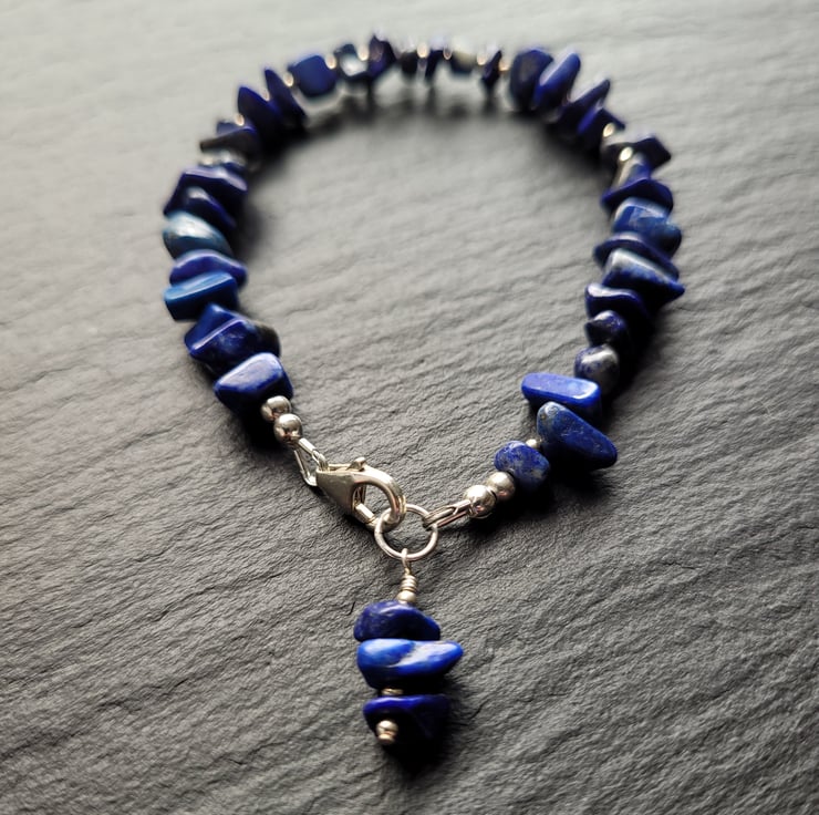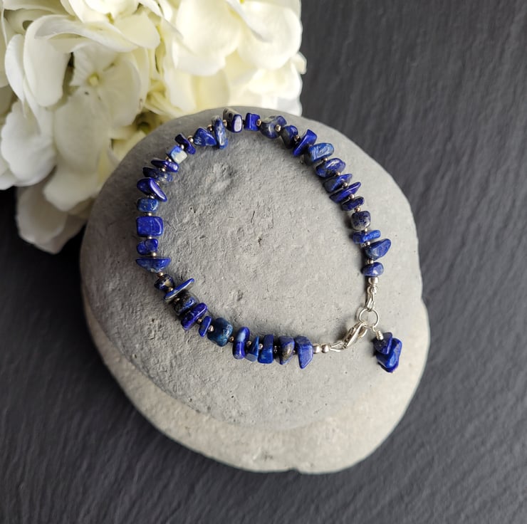 This striking bracelet is made with lapis lazuli chip gemstone beads and small round sterling silver beads. It features a pretty cluster of lapis lazuli chips as a charm next to the carabiner clasp. All the metal elements on this bracelet are sterling silver.