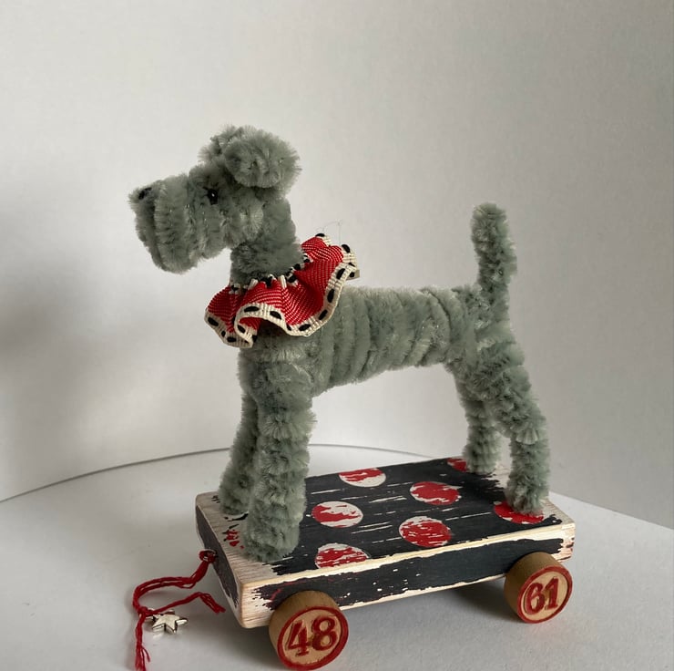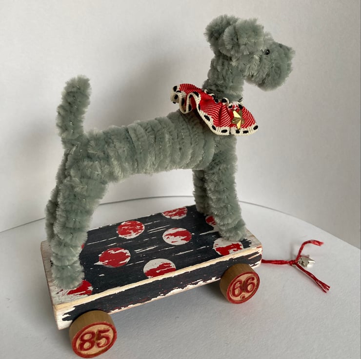 Mr Grey is standing 11.5 cm tall on his hand painted and distressed wooden trolley. He measures 11cm across and sports a cotton ruff with a gold star embellishment.