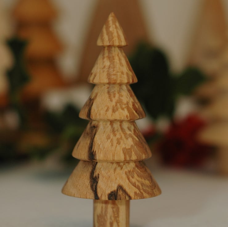 Small turned tree made from spalted beech which gives it the dark pattern in the grain. The tree is 9cm tall and it is finished in beeswax and linseed oil balm. These look good grouped in odd numbers or with other designs and sizes of trees.