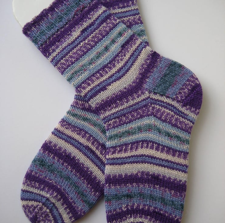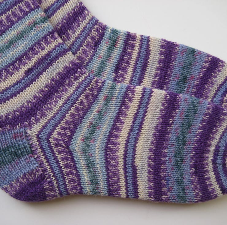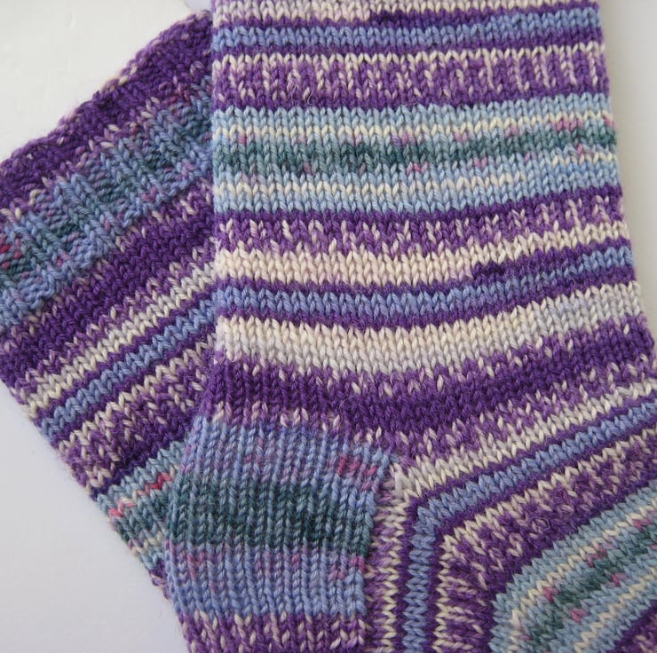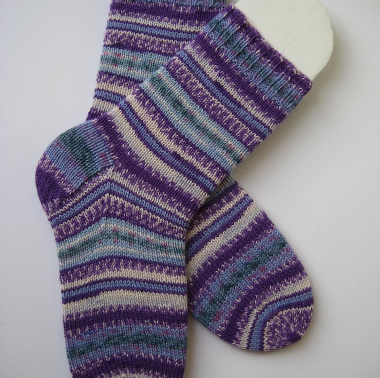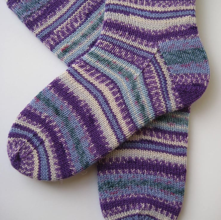 Hand knitted in the round on 5 double pointed needles, these matching wool socks are made from Regia 4 ply self patterning sock yarn (75% wool 25% polyamide yarn) in shades of purple, blue, pink and cream. Made from very fine yarn, they are not too thick and will fit most footwear. Warm and durable, these socks will keep your feet comfortable and bright throughout the year.