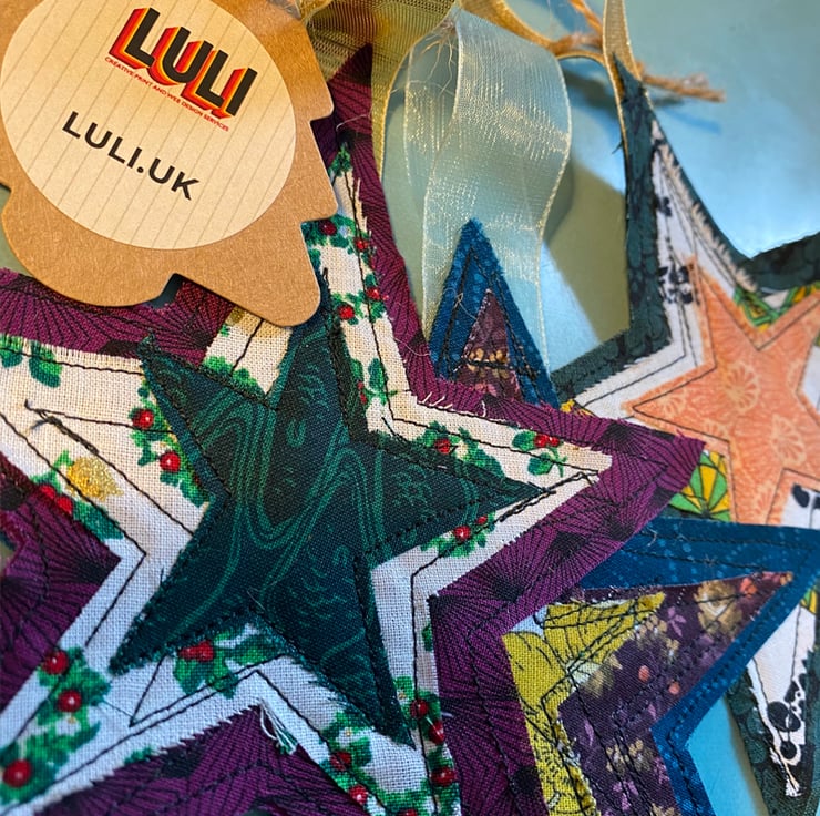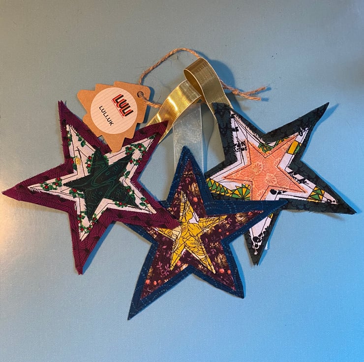Set of 3 multi-coloured Christmas tree decorations for your home, made with love using recycled clothing and fabrics, rough cut and machine embroidered. Natural fraying will occur enhancing the look of the scrappy stars as they age. This is not a fault.