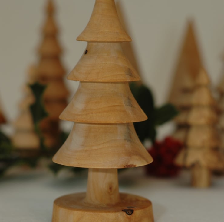 Turned tree made from silver birch that had just started to spalt causing the darker patterns in the grain. The tree is 17cm tall and it is finished in beeswax and linseed oil balm. These look good grouped in odd numbers or with other designs and sizes of trees.