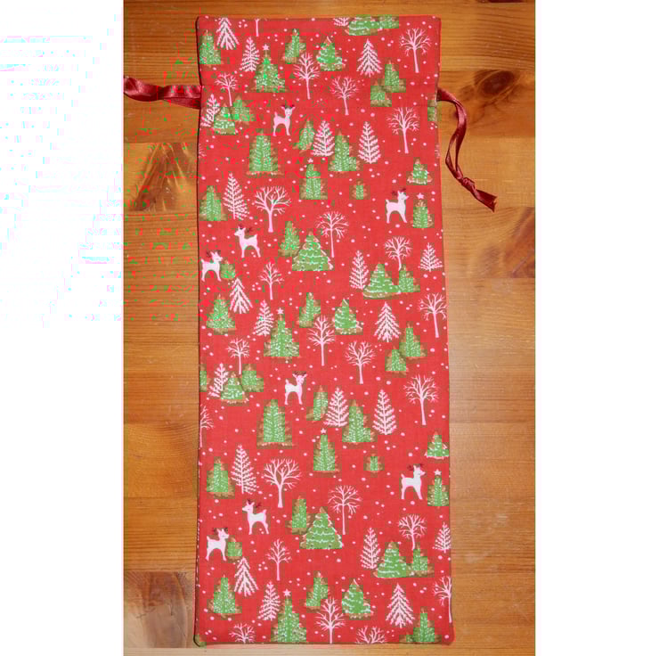 This handmade bottle bag is very attractive and can be re-used year after year. This will save so much paper and card, and has a very attractive look to it. A lovely way to present a luxury bottle of fizz, or any wine. It measures 6 inches wide by 15 inch deep. (approx. 15 x 38 cm.) It has a drawstring fastening, and is lined in cream fabric. The fabric features cute Christmas trees and deer.