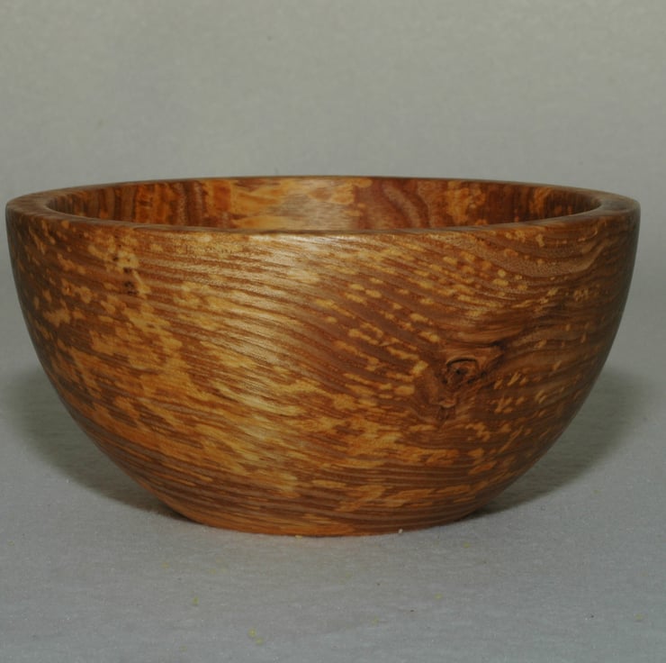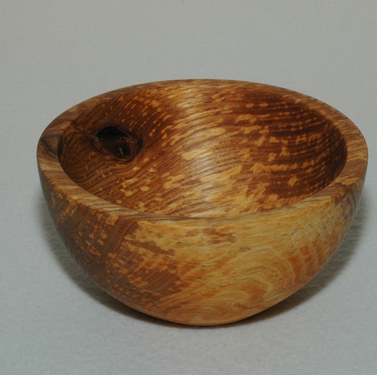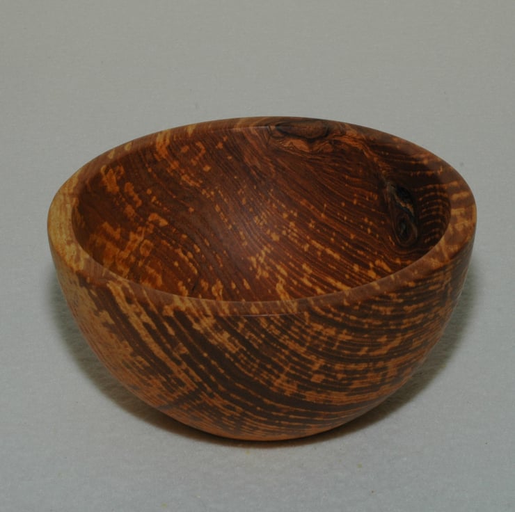 I'm unsure what wood this is but it has amazing spalting giving the stripes in the grain. There is a knot or branch inclusion which goes all the way through the bowl. The bowl has a flat bottom and is approximately 7cm tall and 14cm in diameter. It is finished in a food safe beeswax and linseed oil balm giving a light sheen finish. the turning recess remains on the bottom with my "LD" makers brand.