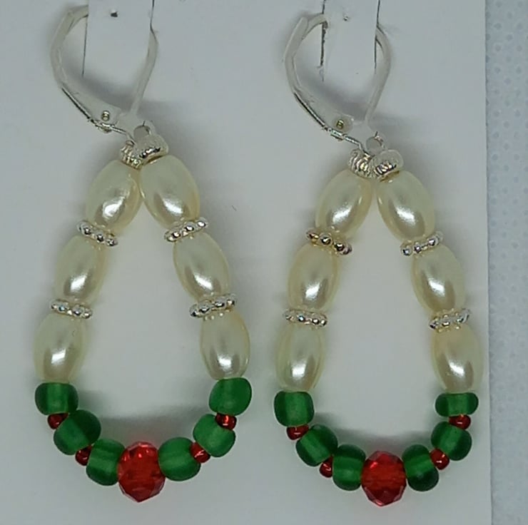 Cream oval glass pearls with daisy spacers complement the frosted green glass beads, red seed beads and red rondelle in these pretty loop earrings with silver plated lever back earring hooks. Each earring measures 3cm long (not including the hooks).