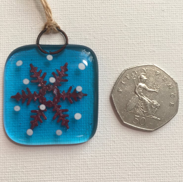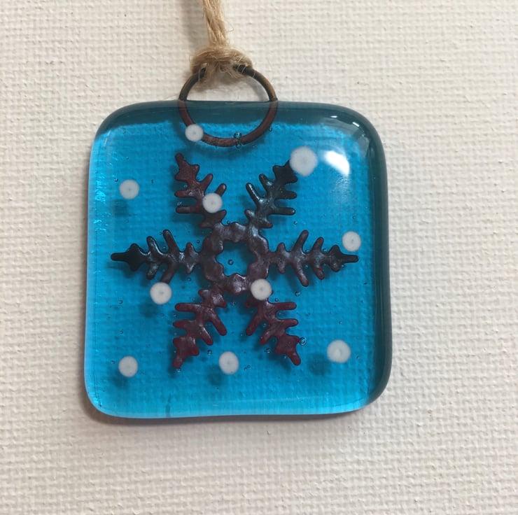 These little tree decorations are made by cutting squares of blue glass and squares of clear glass. I then cut snowflakes from fine copper sheet using a die cutter and these are sandwiched between the two squares along with loops of copper wire for hanging. I then apply dots of snow to the clear top layer using white glass paint. They then go into the kiln for approx 7 hours. After cooling down overnight they will have fused together to form soft rounded edges and the copper has reacted to the intense heat and will have randomly changed colours to anything from deep reds to petrol blues. Sometimes an ombré mix of both.