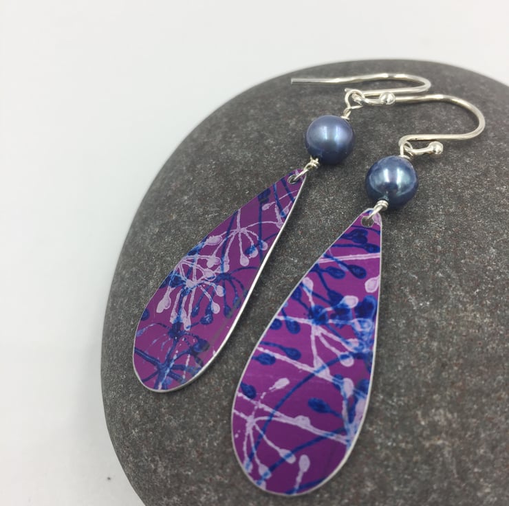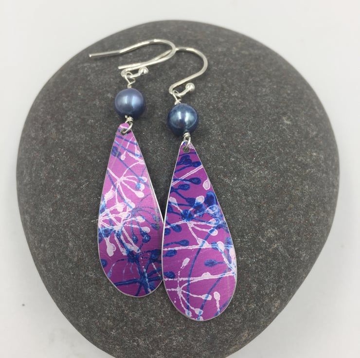 Hand printed and pierced drop shaped earrings in dark pink. The printed design is cow parsley and I have added a blue freshwater pearl. They hang from sterling silver ear hooks and measure approx 4cm in length.