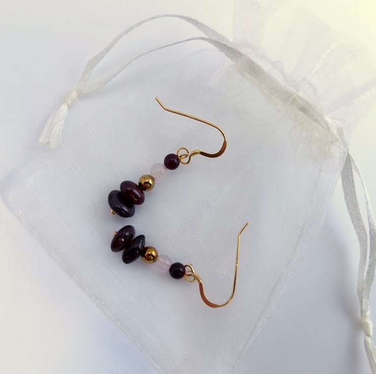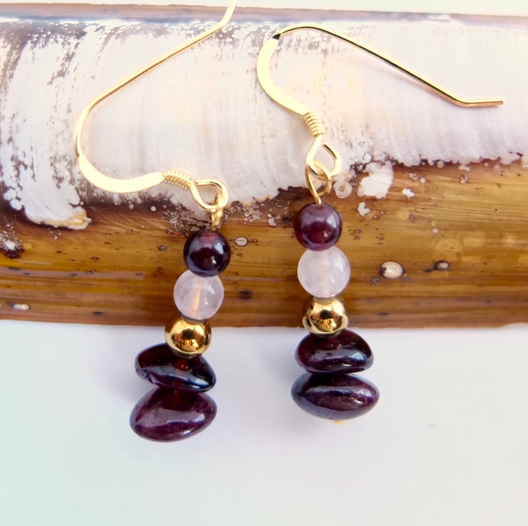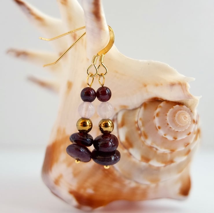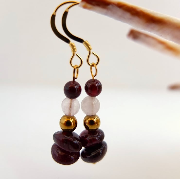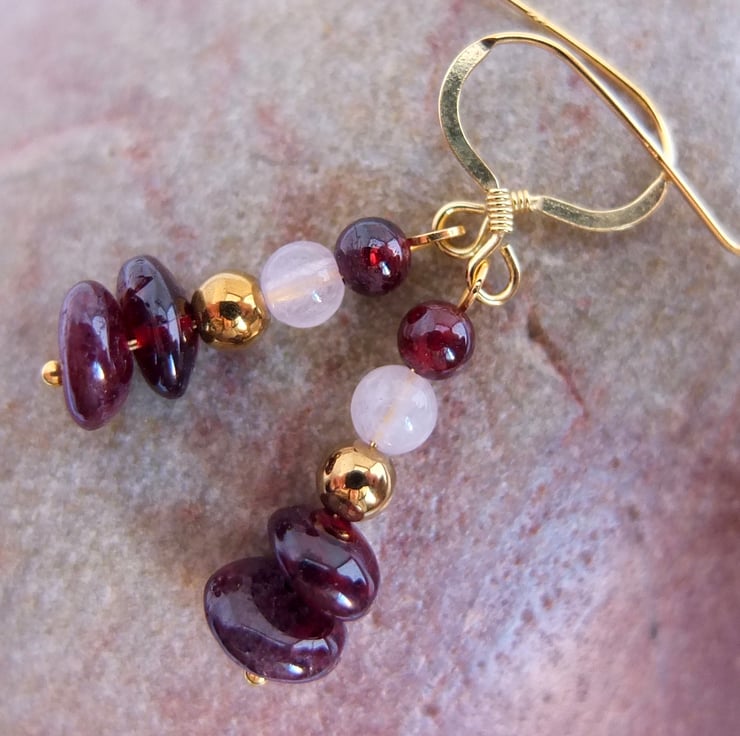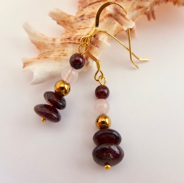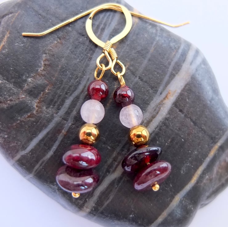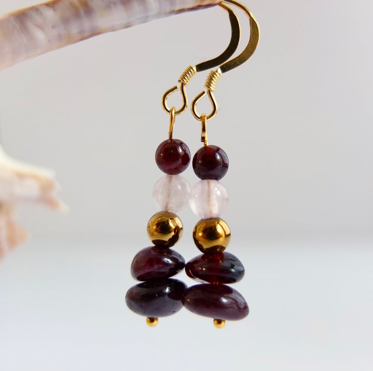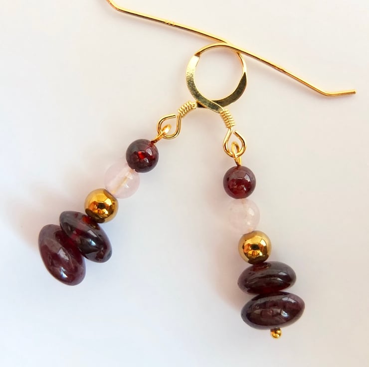 Two semi-translucent, polished garnet nuggets with round beads of golden hematite, rose quartz and garnet are suspended from ear-wires of gold vemeil.