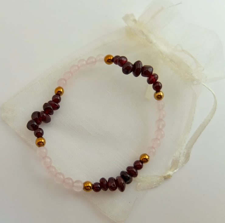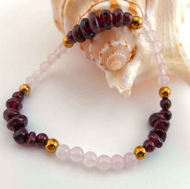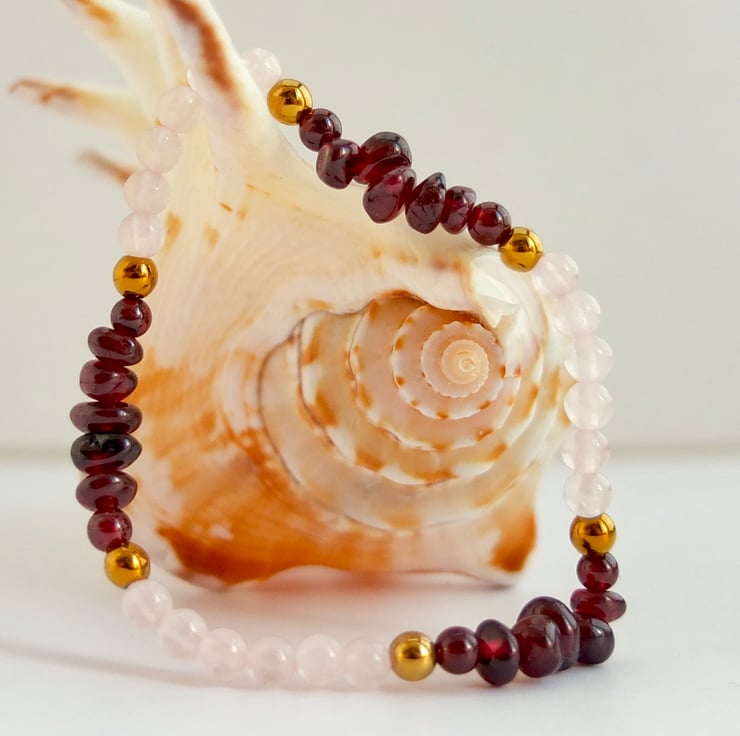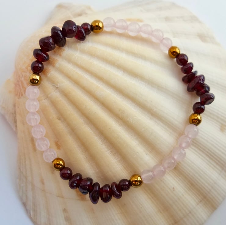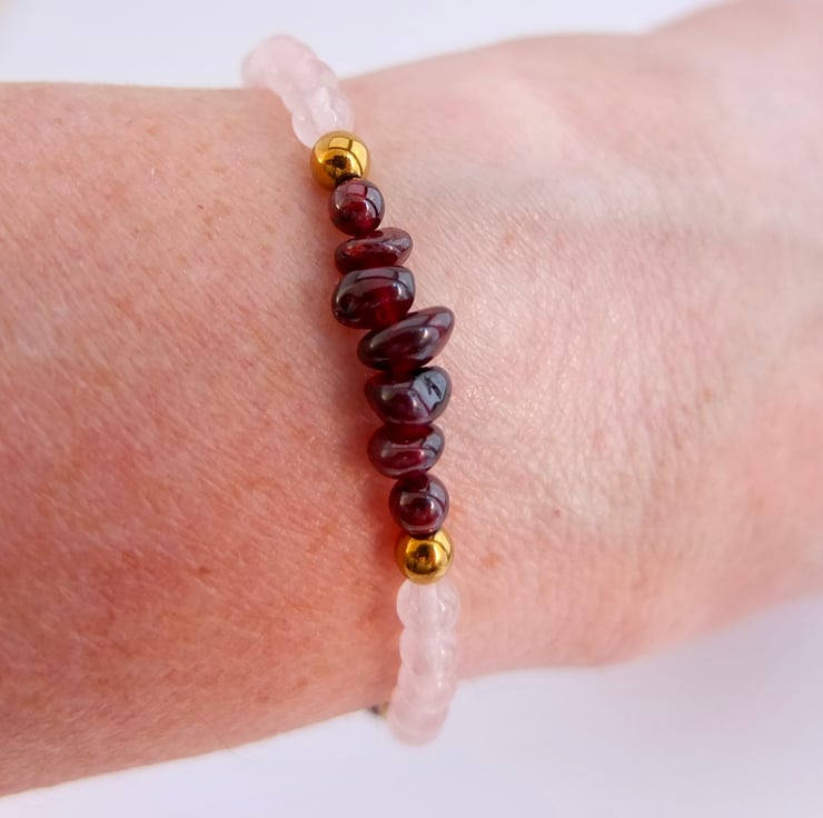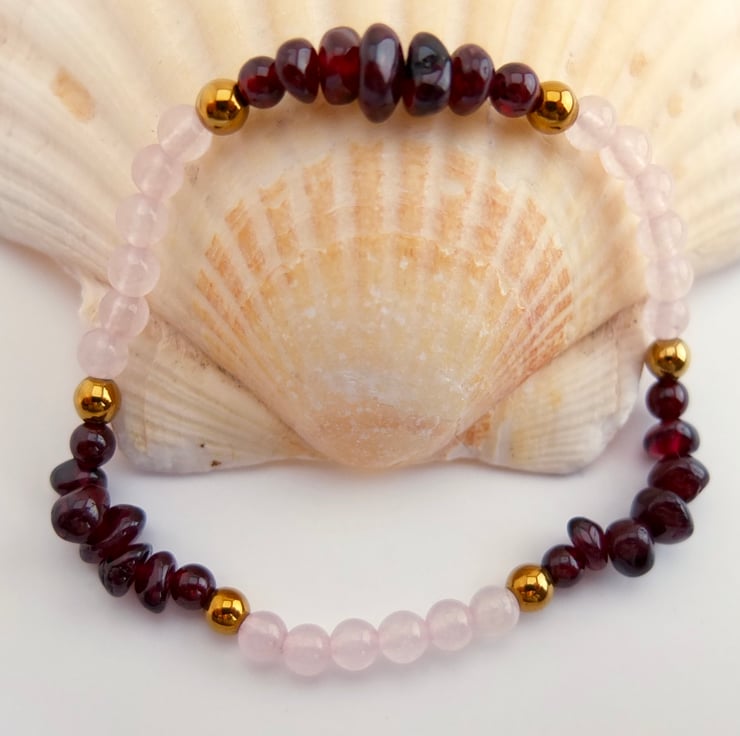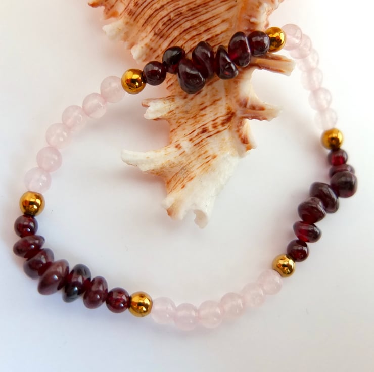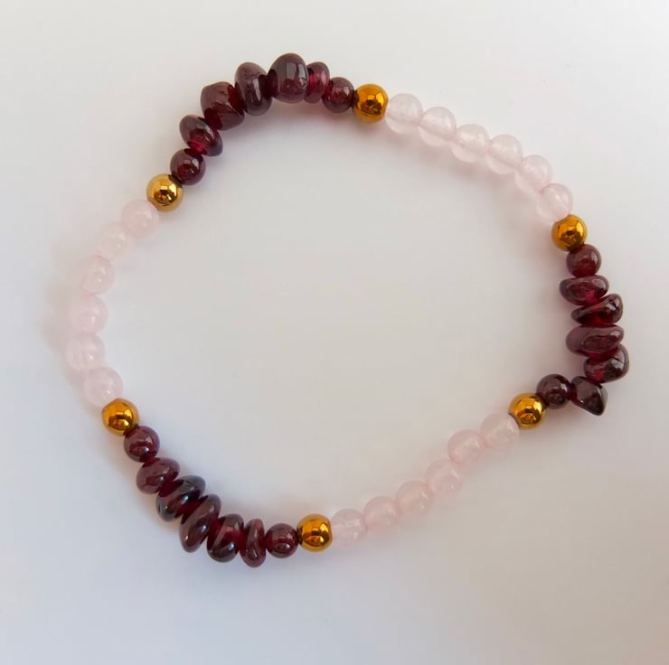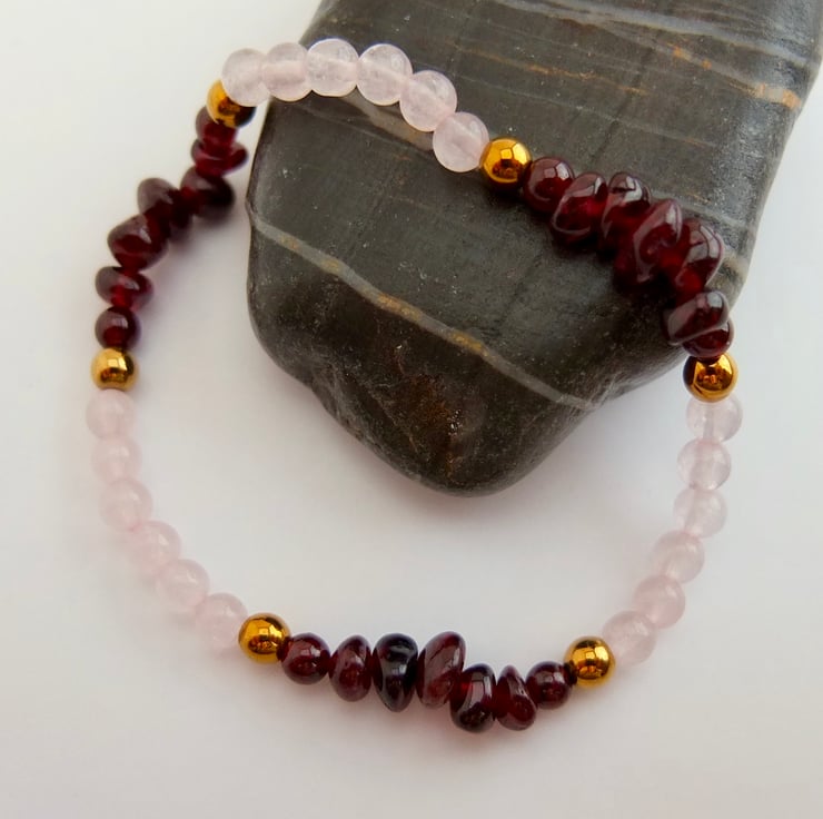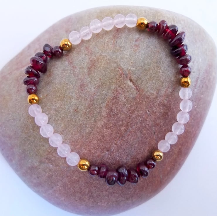 Stretch bracelet made from semi-translucent, polished garnet chips, 4mm garnet rounds and 4mm rose quartz beads, accented with shiny golden hematite.