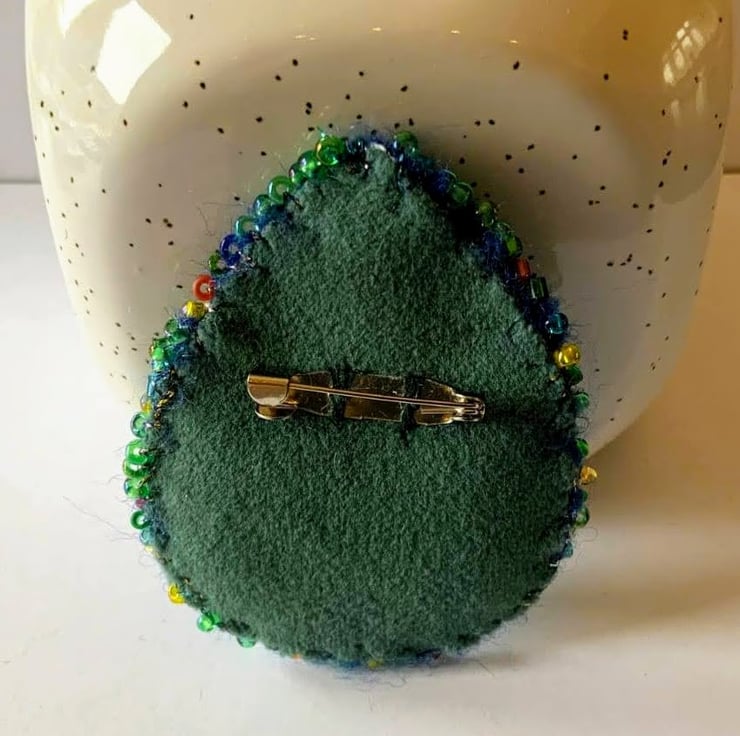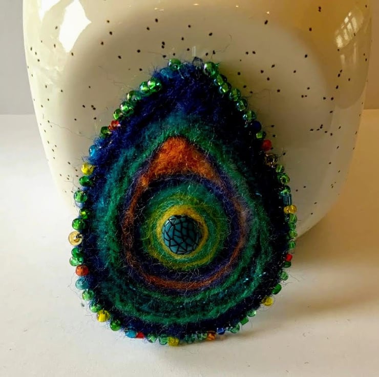 Merino wool in blues, greens yellow and orange. Featuring a crackeled effect teal blue bead in the centre and mini colourful glass seed beads embroidered around the edges to give some shimmer and sparkle.