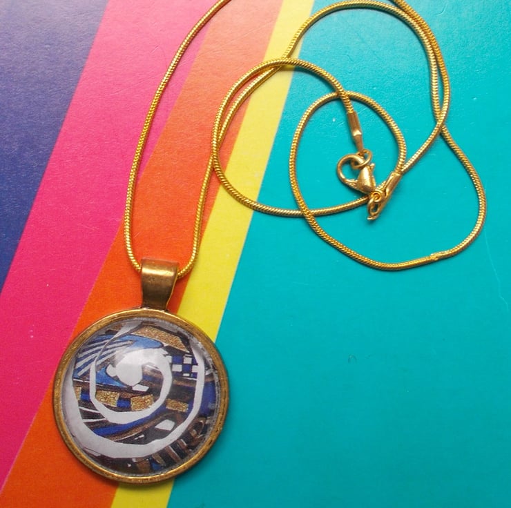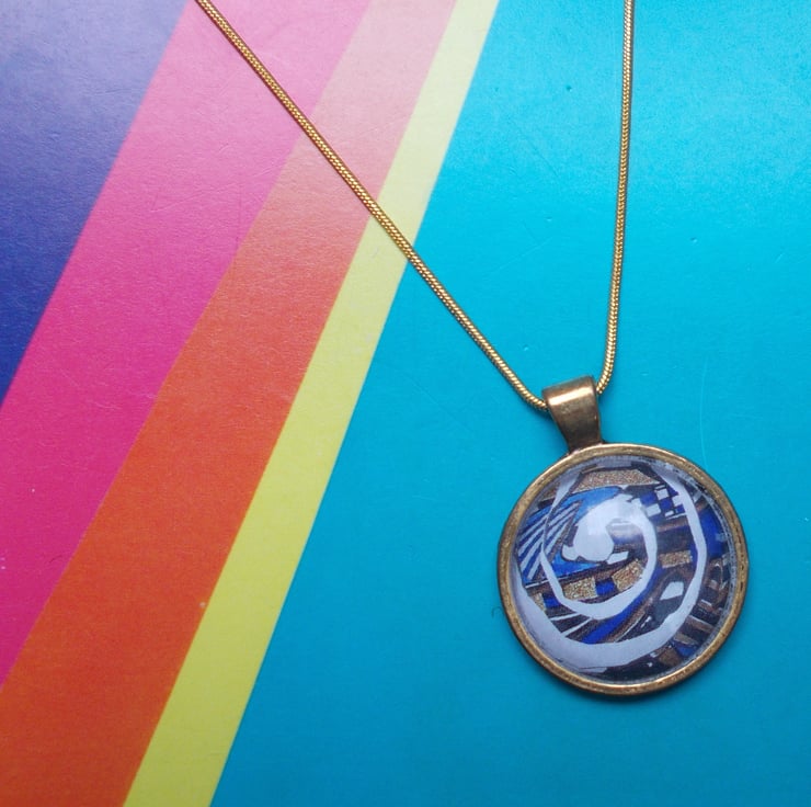 A tiny original mini print of a gorgeous blue spiral with flecks of gold, white and black sitting inside a round golden pendant with a round magnifying glass cabochon. A simple and stylish piece of jewellery hanging on a gold plated snake chain with a safety catch.