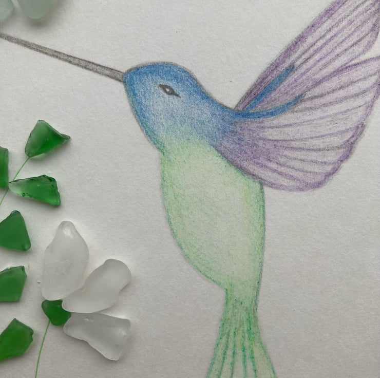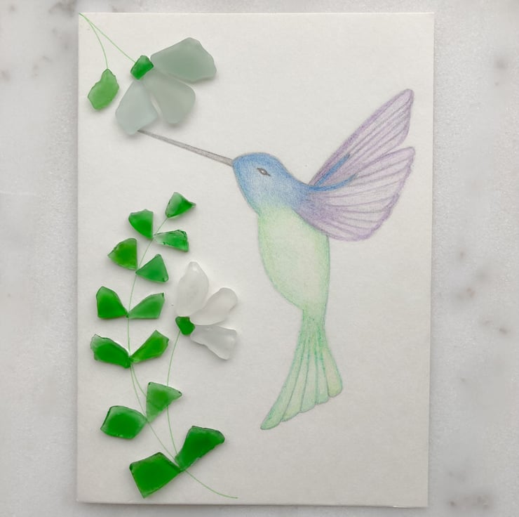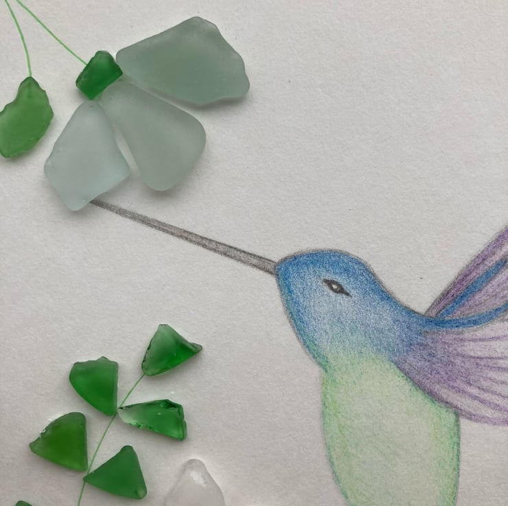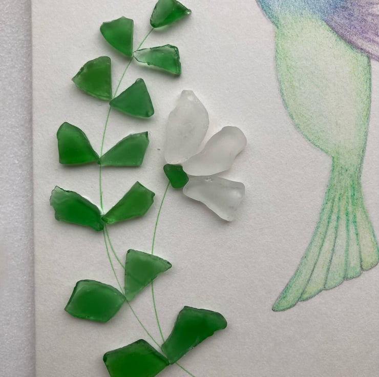 Hand drawn in water colour pencil and embellished with sea glass found by myself on beaches in Falmouth, Cornwall.