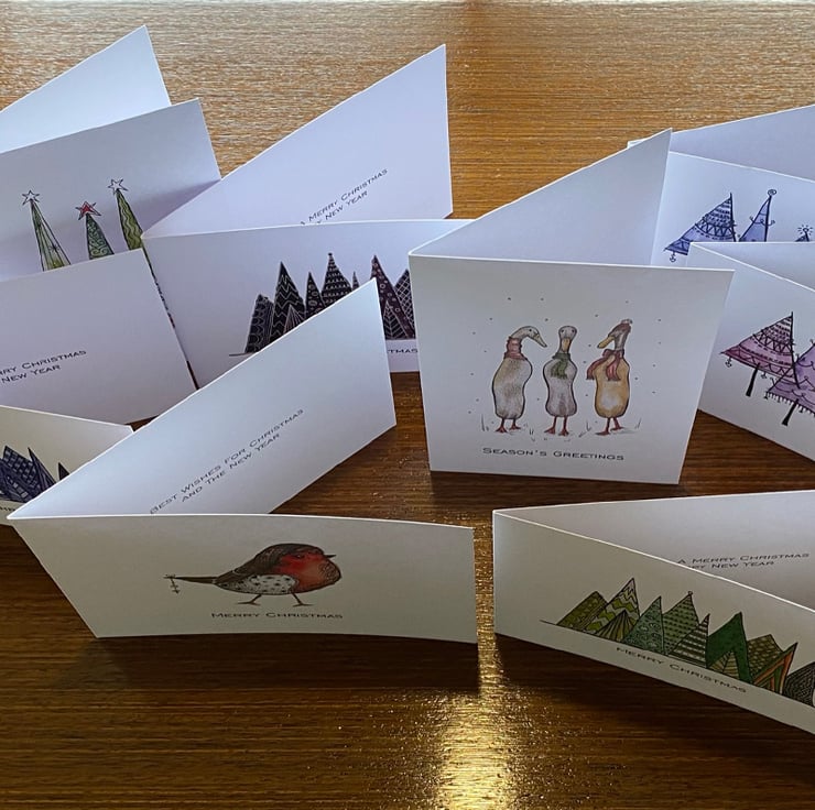 Pack of all 8 Christmas card designs including: Rockin' Robin, Bishopstone Winter Runners, We Three Trees, Wiltshire Winter Woods Green, Wiltshire Winter Woods Blue, Wiltshire Winter Woods at night, Christmas Trees Purple, Christmas Trees Blue.