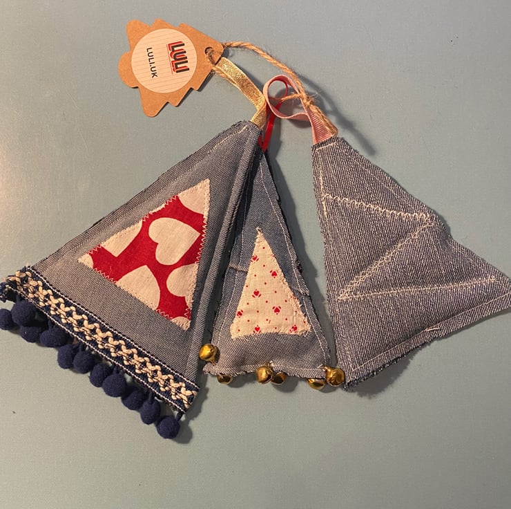 Made with love using recycled clothing and fabrics, rough cut and machine embroidered. Natural fraying will occur enhancing the look of these decorations as they age. This is not a fault.