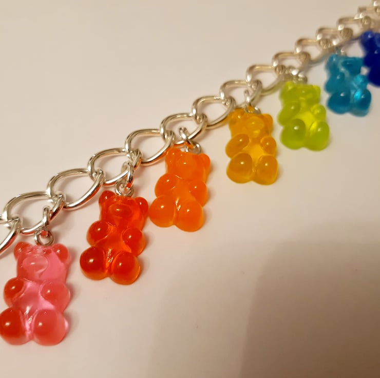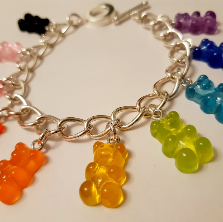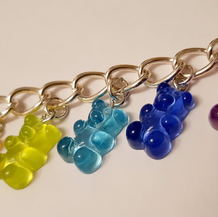 Gorgeous resin gummy bear charms in every shade of the rainbow dangle from a substantial silver plated chain bracelet which fastens with a toggle clasp.