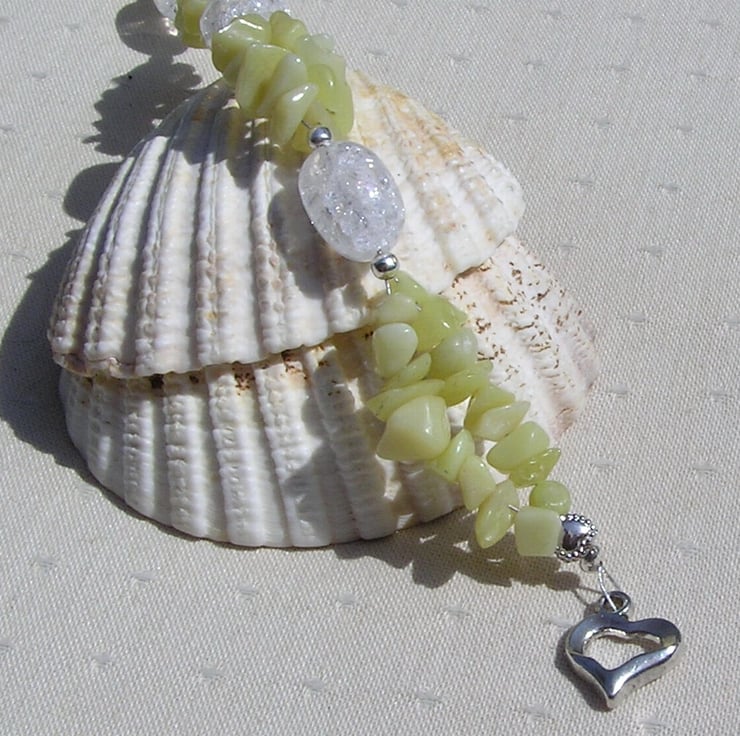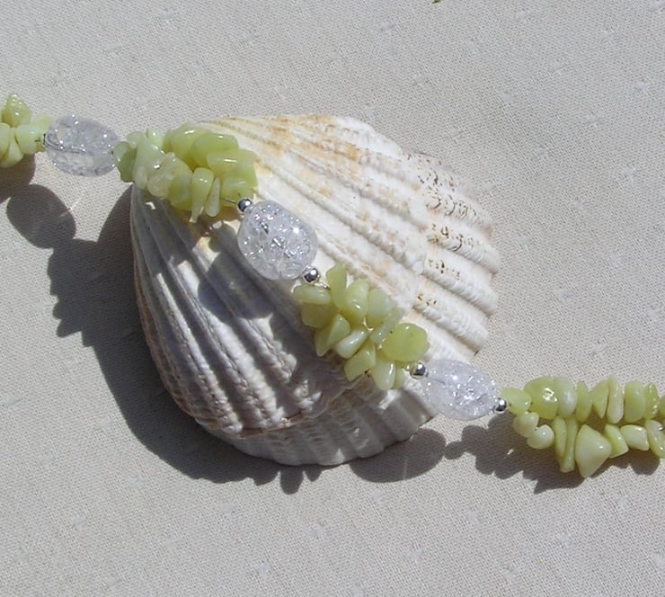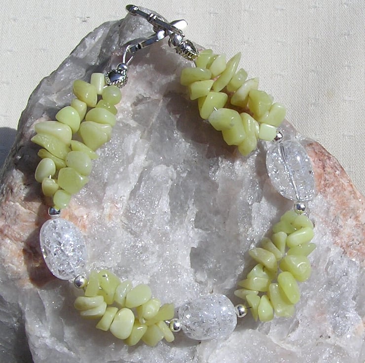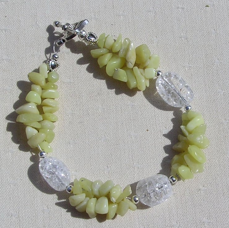 This Stunning Bracelet is made from three Chunky Crackled Quartz Nuggets separated by double-stranded Lemon Jade Gem Chips along with tiny Silver spacers - a Beautiful glistening combination that will look stunning either worn casually or with something more Elegant for a Special Evening out