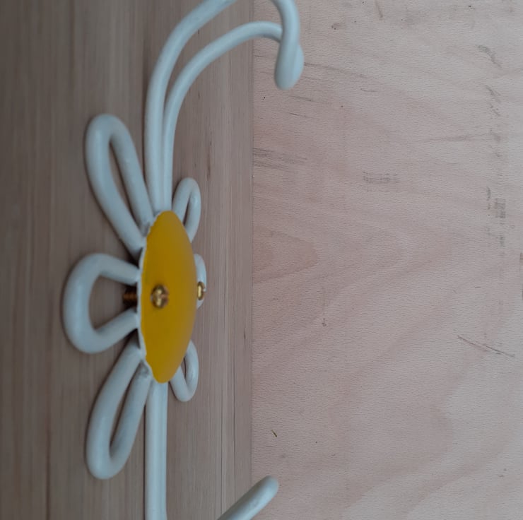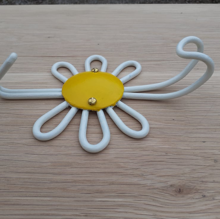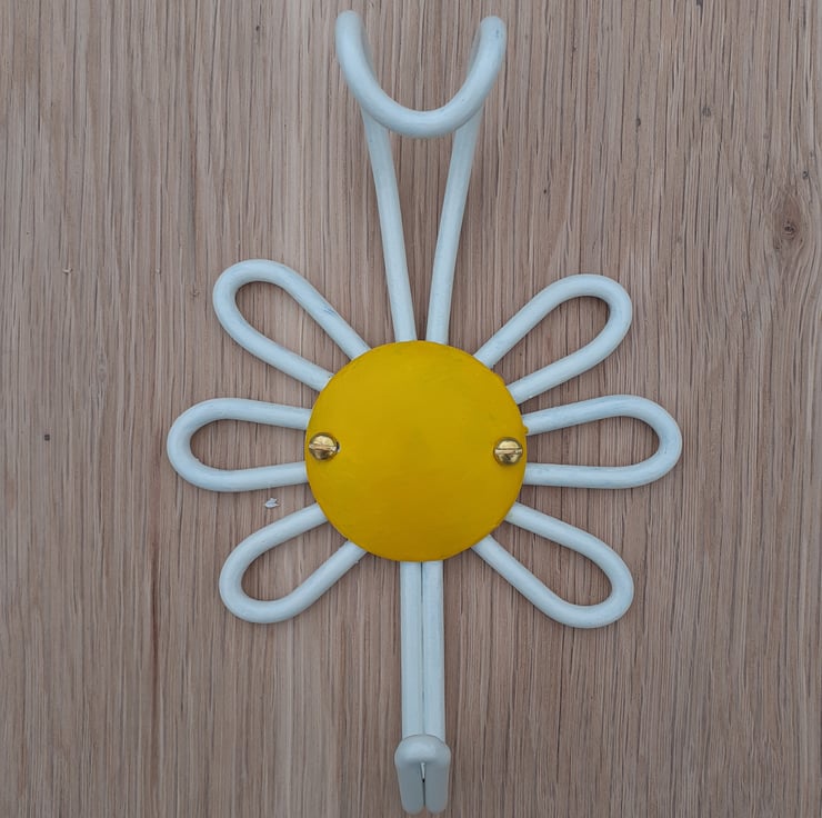 This lovely handmade coat hook is made from 6mm steel rod with a steel dished disc welded on for the centre. It is simple and naive in its design and eye catching on any wall with its vibrant yellow heart shining out. As with all my coat hooks it has a smaller lower hook for tabbed coats and a larger upper hook for hoods and hats. It is approximately 215mm x 150mm x 80mm.