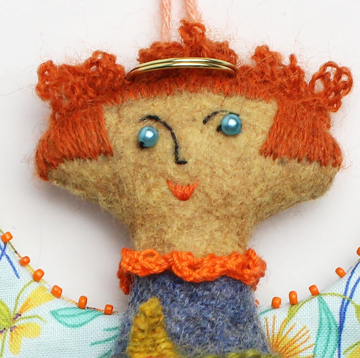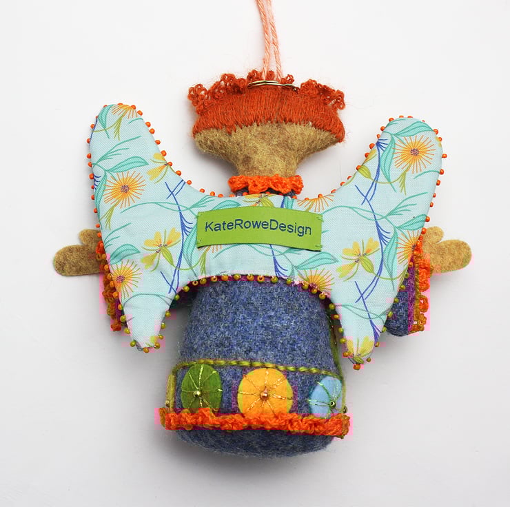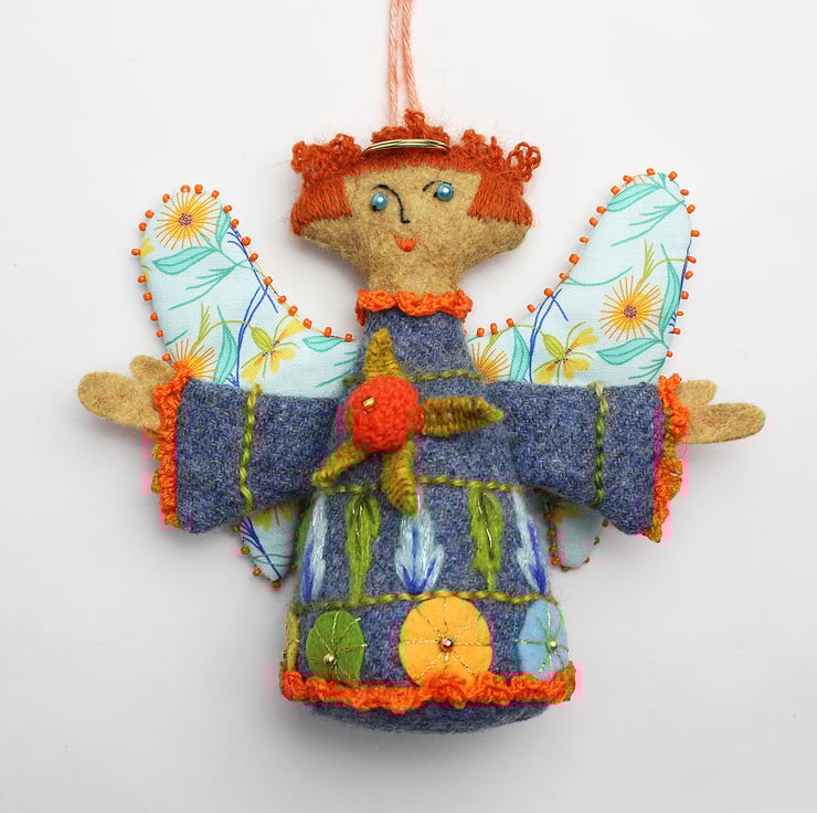 This is a handmade angel to be used as a hanging ornament or decoration. It has been made out of blue wool fabric and felt (for the flesh parts) and all the facial details/hair are hand embroidered and the dress is hand stitched with a floral design. She has a string attached to hang her with and she has cotton marigold printed wings. The seams on the angel are trimmed with crochet and the wings trimmed with beads. She has a halo and she would love to make a Christmas visitation!