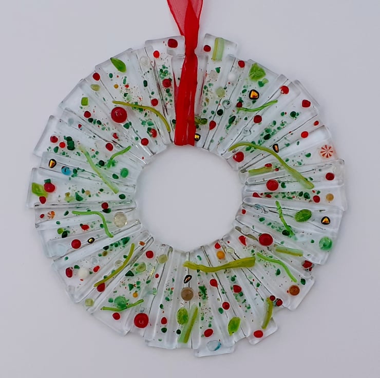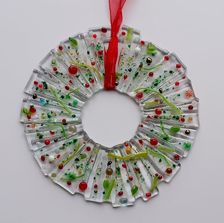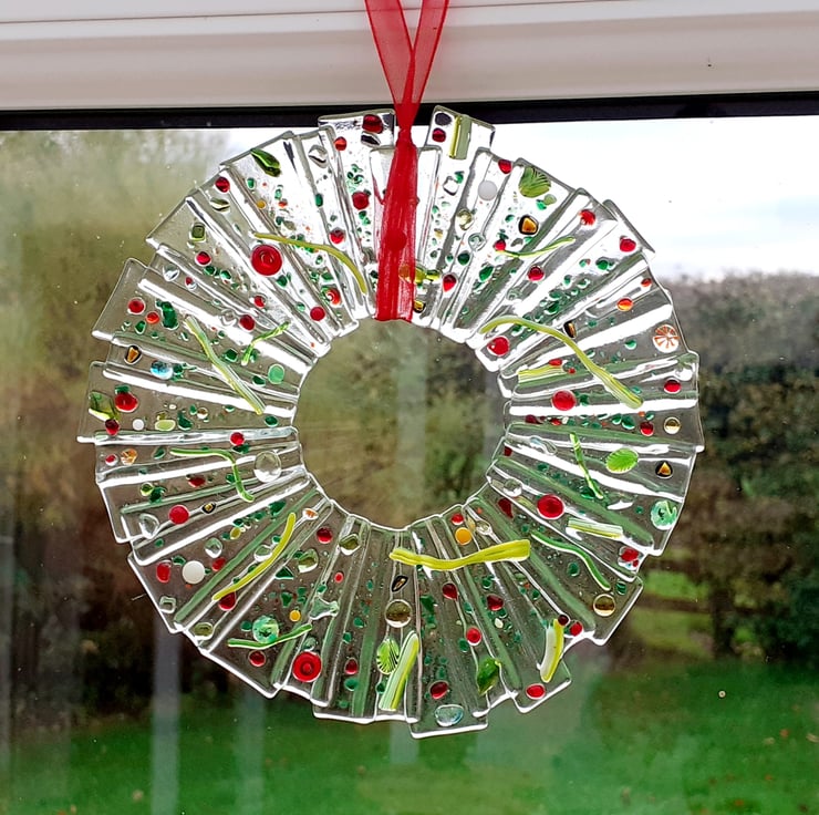 Fused glass Christmas wreath of icy clear glass decorated with green leaves and stems and a selection of festive coloured glass berries. Finished with a red organza ribbon and ready for hanging either on a wall or in a window. Size approx 6" (15cm).