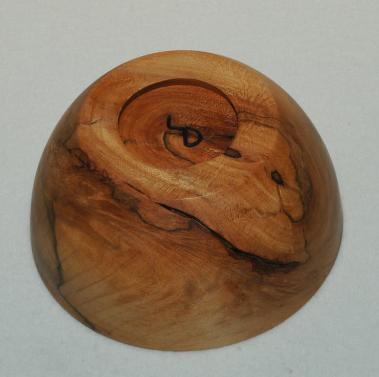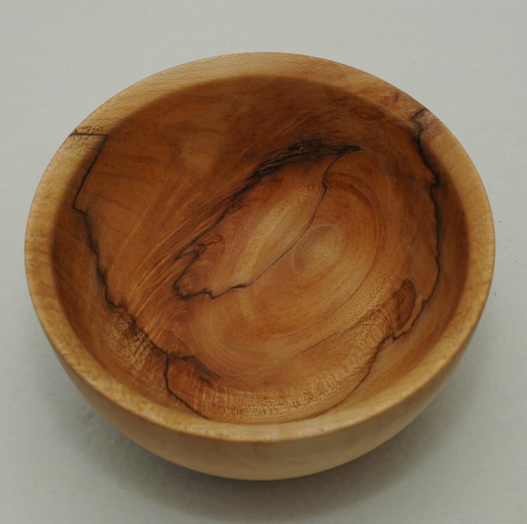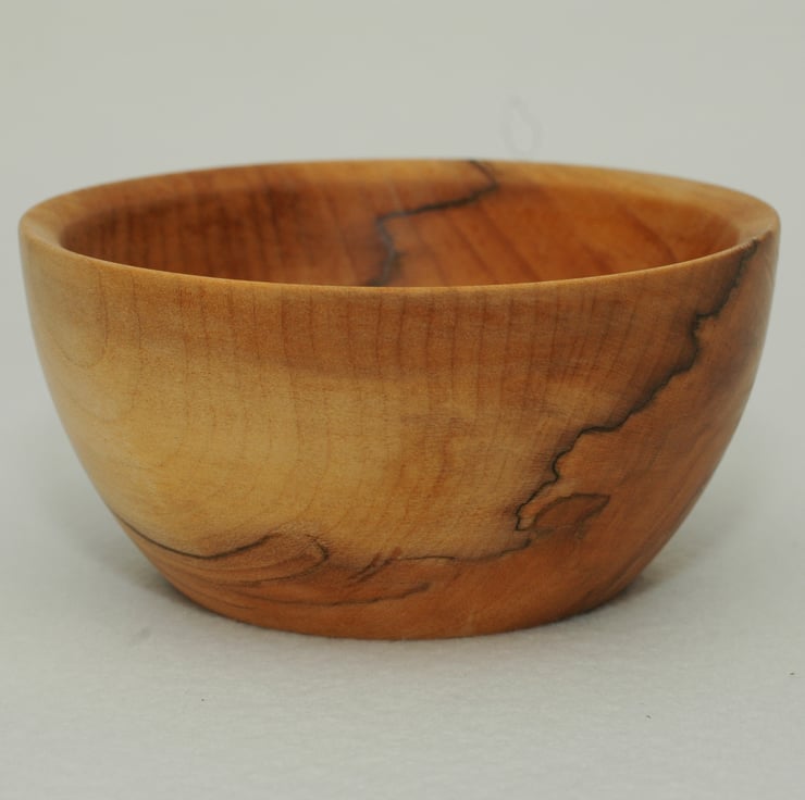 This maple bowl is turned from a piece of tree that was felled at the end of our road. The wood started to spalt which is a natural process caused by fungus in the wood and which gives the darker lines in the bowl's grain. The spalting has led to some minor surface cracking which adds to the beauty of the wood. The bowl has a flat bottom and is approximately 7cm tall and nearly 14cm in diameter. It is finished in a food safe beeswax and linseed oil balm giving a light sheen finish. The turning recess remains on the bottom with my "LD" makers brand.