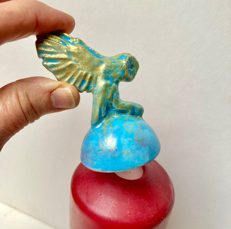Handmade ceramic candle snuffer, created using my own original moulds then hand finished and glazed to make each one unique. This owl has a sky blue earthenware glaze with distressed faux gold highlights making it a complete one iff single edition.