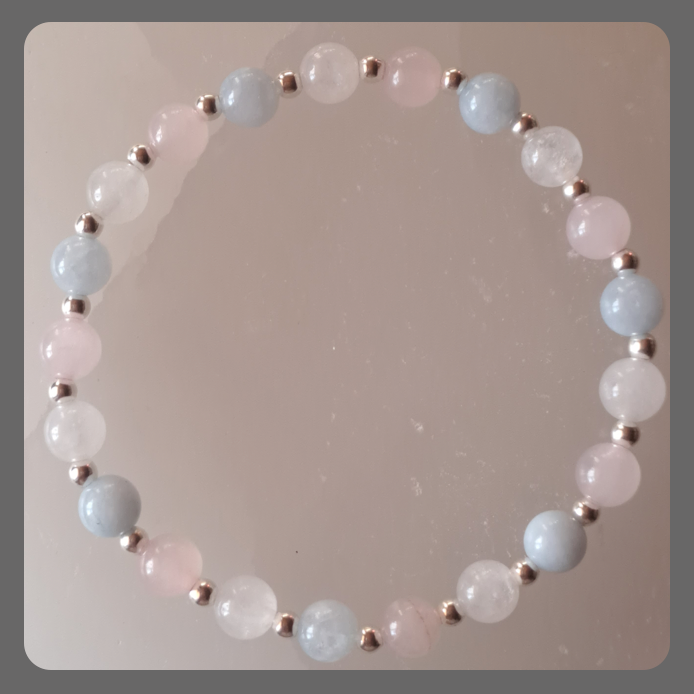 Elasticated Rose Quartz, Aquamarine and White Jade bracelet with sterling silver beads.