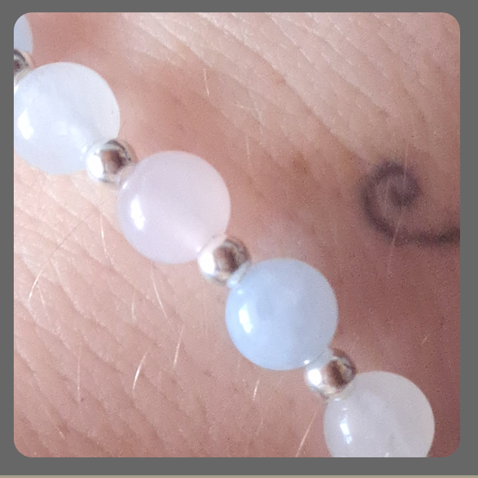 The Rose Quartz, Aquamarine and White Jade beads are about 5mm and the silver beads are 3mm. The bracelet is elasticated. It is best to roll it on and not pull.