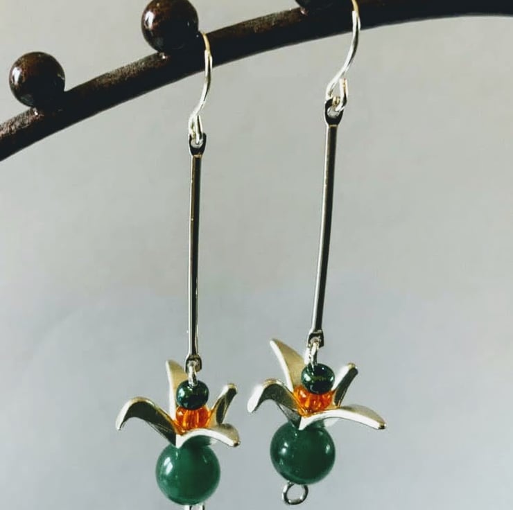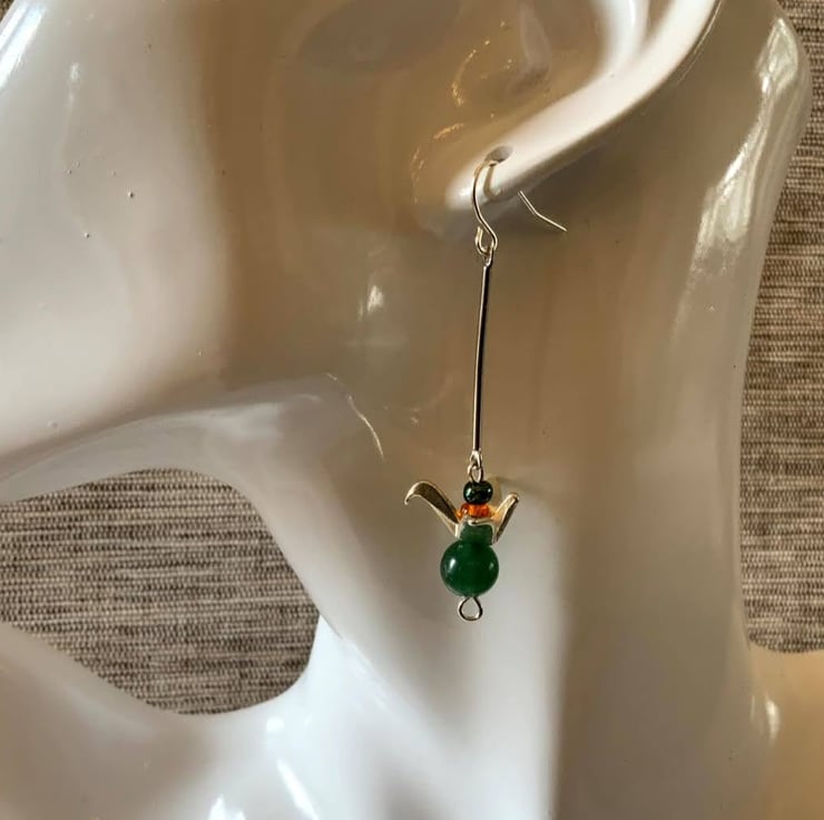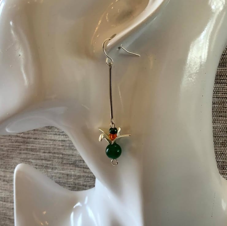 The crane birds cradle two mini rochelle glass beads in dark green and burnt orange.