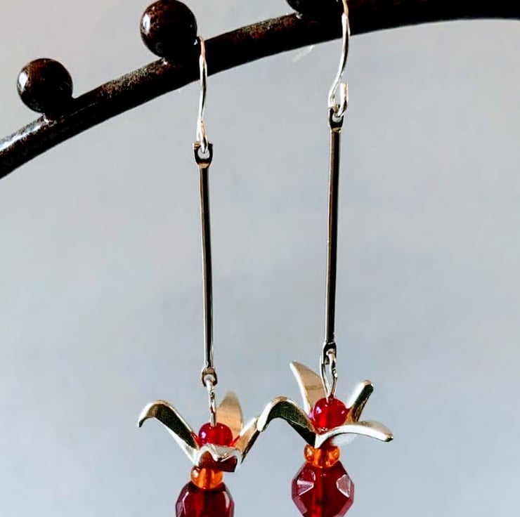 The crane bird cradles a red glass mini rochelle bead . Below is a red faceted glass bead with burnt orange mini glass rochelle top bead and a loop at the bottom.