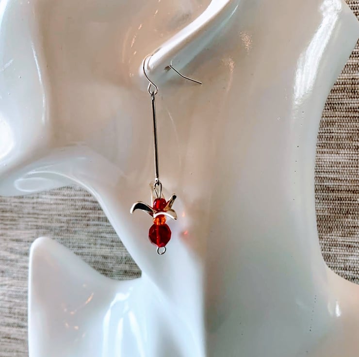 The crane bird cradles a red glass mini rochelle bead . Below is a red faceted glass bead with burnt orange mini glass rochelle top bead and a loop at the bottom.