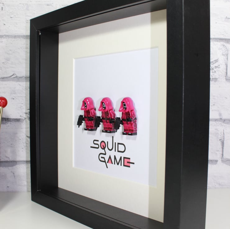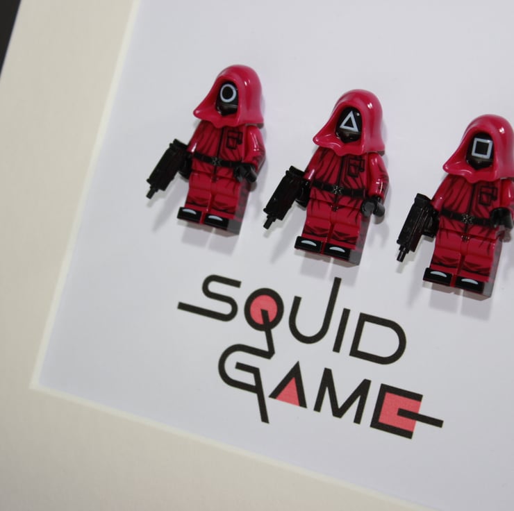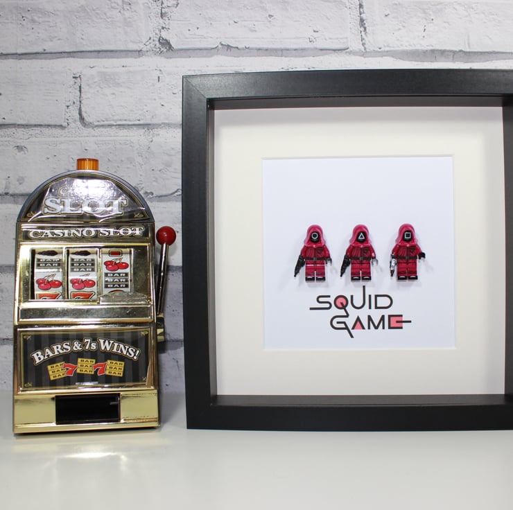 This latest offering comes from the Netflix phenomenon, Squid Game. This series has certainly captured the imagination and attention of a lot of people. This frame features a set of three workers from the games. We have mounted these worker minifigures in to a deep box frame. These little guys can either be framed on a black background or alongside the TV show's logo - just make your selection.