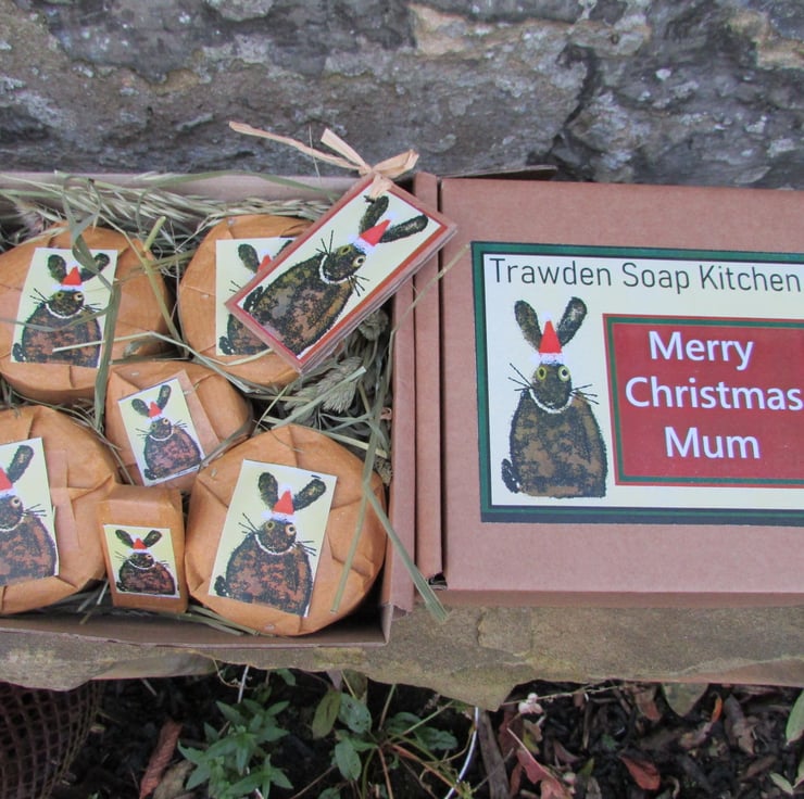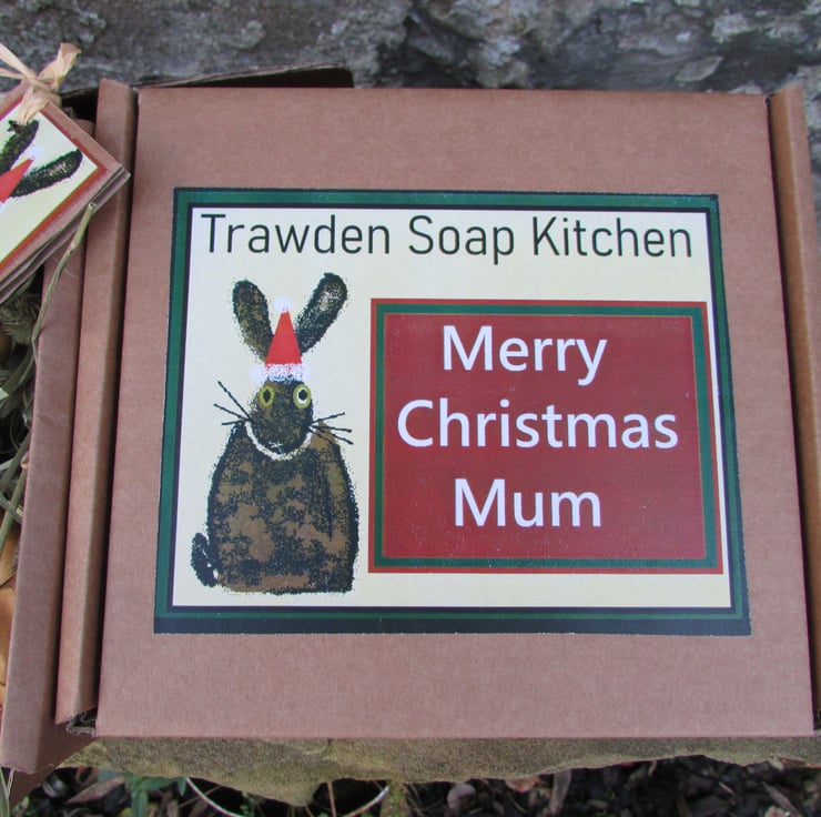 This consists of a tuck in flap box, Festive Joey Rabbit Front Label which will be personalised with your chosen name, there is a gift tag for you to add your longer, personal message.) Each product is wrapped in brown paper with homemade co-ordinated stickers, nestled in a bed of hay