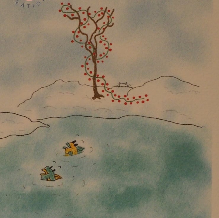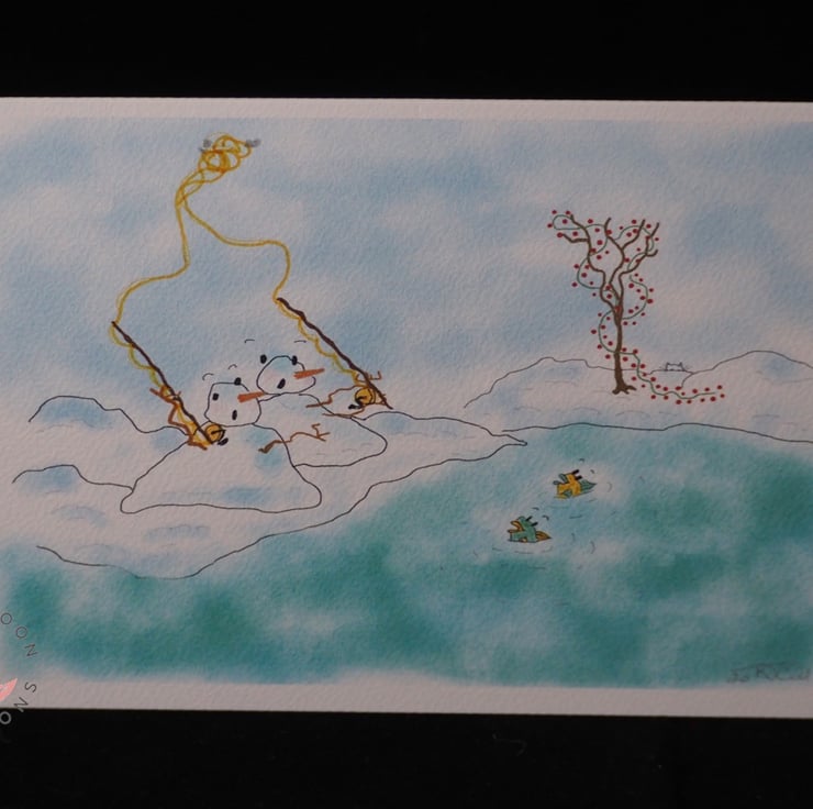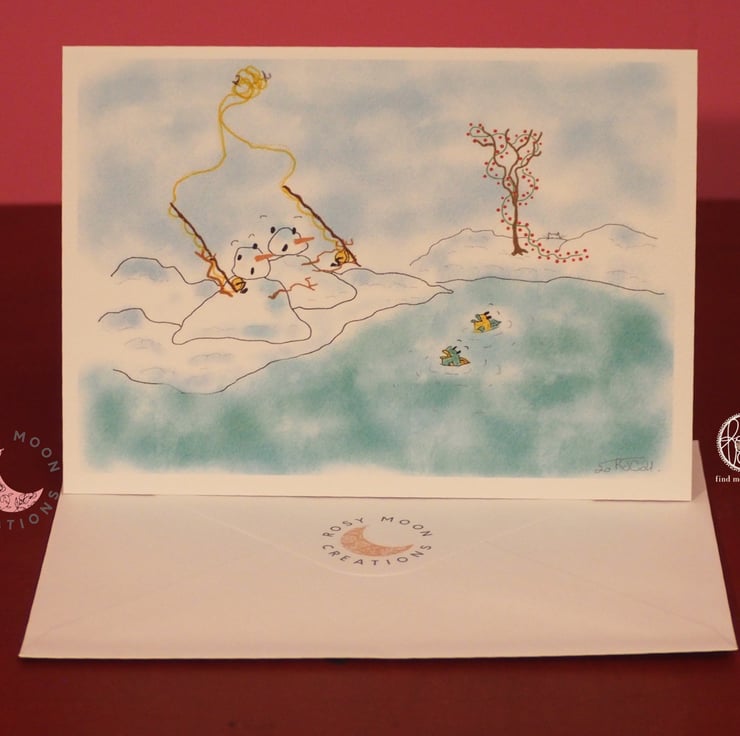 This 12x18cm hand drawn card is printed onto high quality card and features my two naughty snowmen on a fishing trip and if you look carefully, you can see that a mischievous white cat has rearranged the Christmas lights.