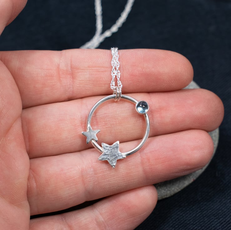 The pendant measures approximately 22mm in height and is hung from a Prince of Wales style sterling silver chain in your choice of length (pick from the drop down menu before adding to basket). Hung by a double jump ring, the pendant will spin between the stars and gemstone, though it's natural balancing point is as shown in the photos.
