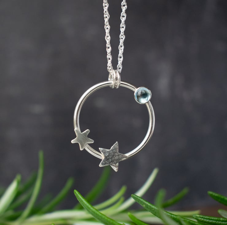 Silver necklace featuring two stars and a 4mm Topaz gemstone. The piece is called 'Starry Night', inspired by my love of star-gazing.
