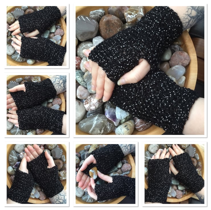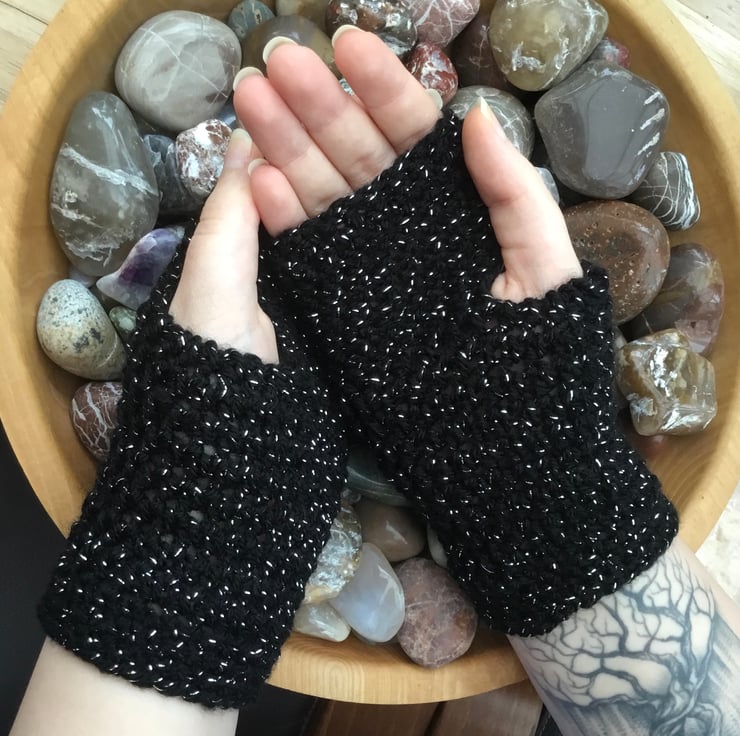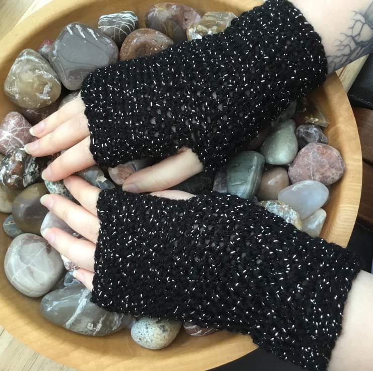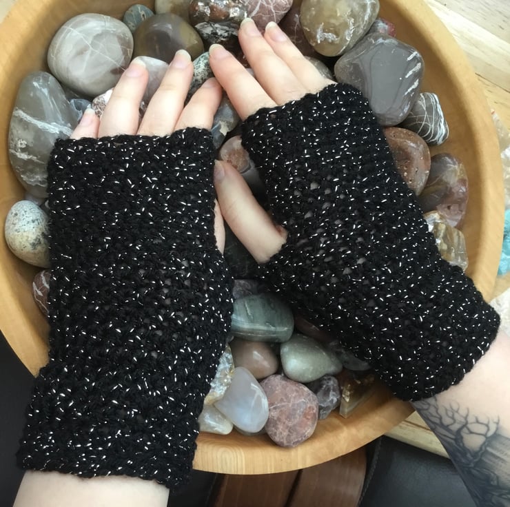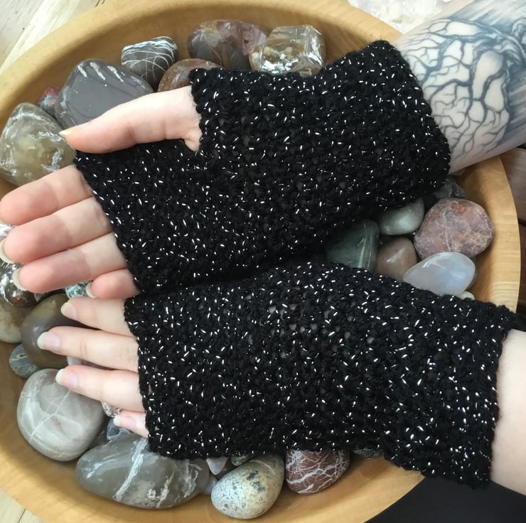 Starry Night! Black twinkle Fingerless mittens are a pair of crocheted accessories to keep your hands warm, cosy and stylish! Crocheted in James C Brett black twinkle yarn.