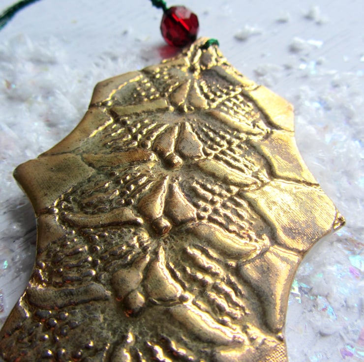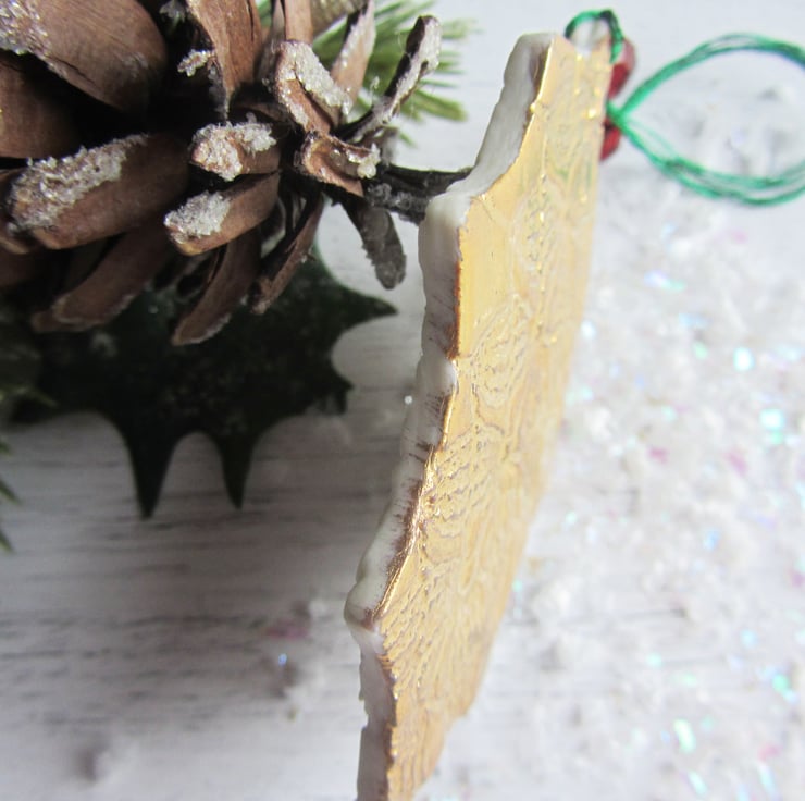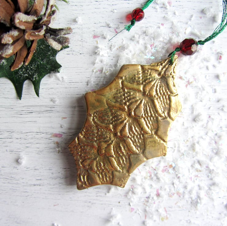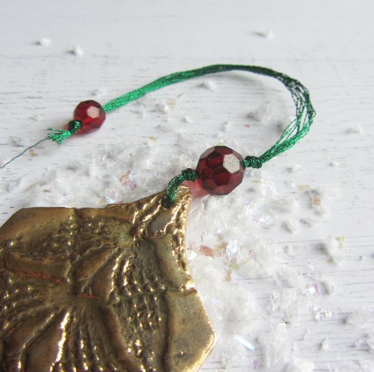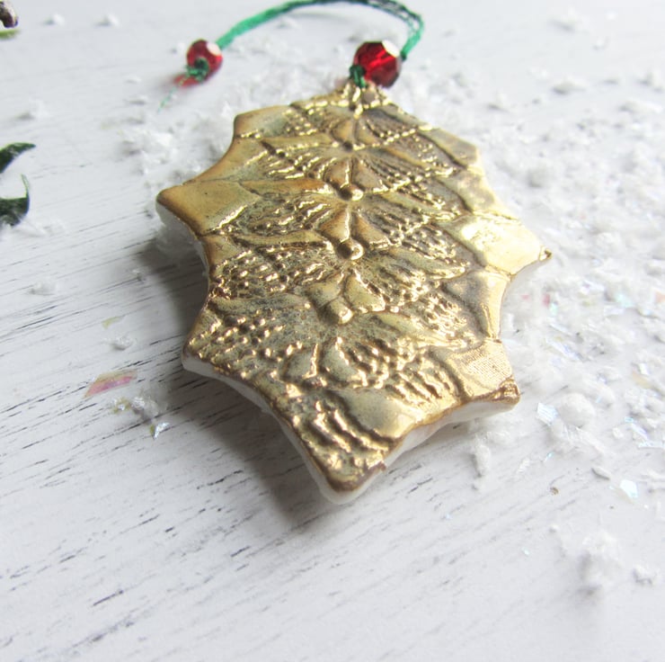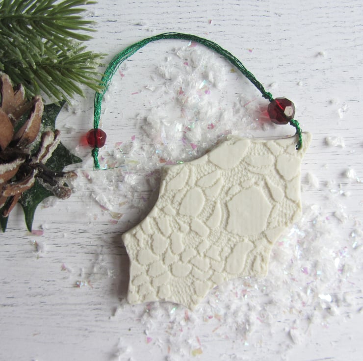 This is a porcelain Christmas decoration in the shape of a holly leaf. Its been imprinted on both sides with lace, before going through its first firing. It is then glazed with a transparent glaze and fired again. Finally, the decoration is painted with ceramic 22ct gold lustre and fired for a third time to give this antique gold finish. All the decorations are threaded with two beads. I use sparkly thread so that catches the light on your tree, and you can choose the position of the smaller bead: either close to the decoration, or have the bead on the branch part, so that makes the branches sparkle. The beads are red to represent holly berries.