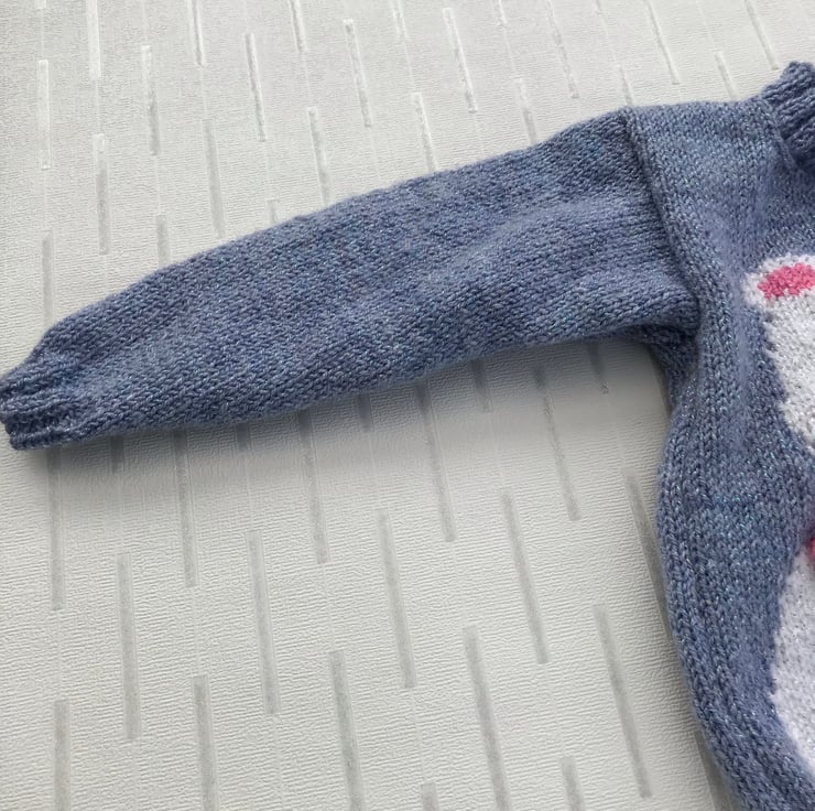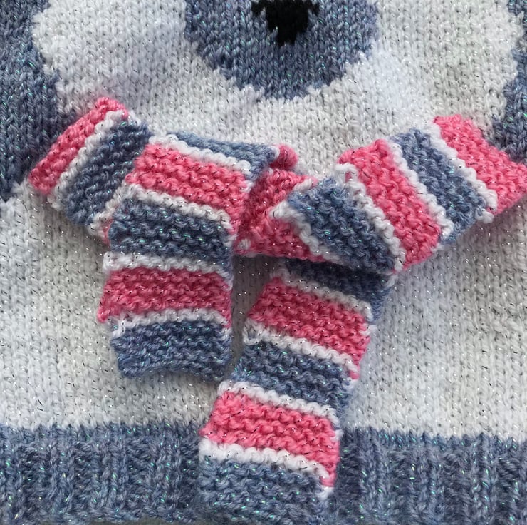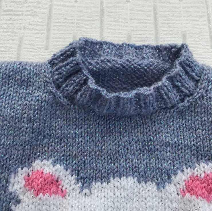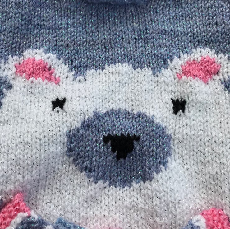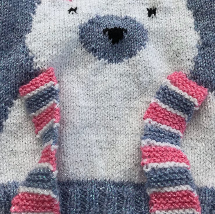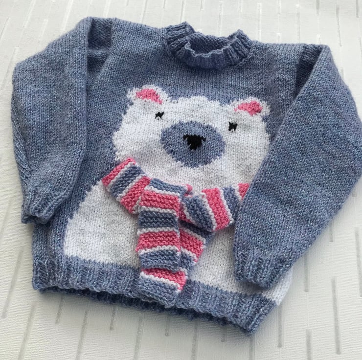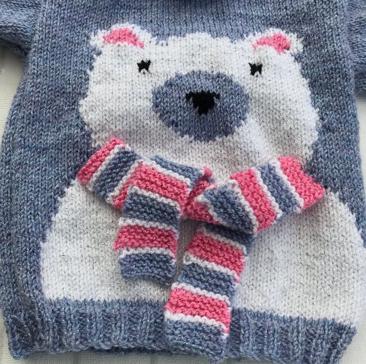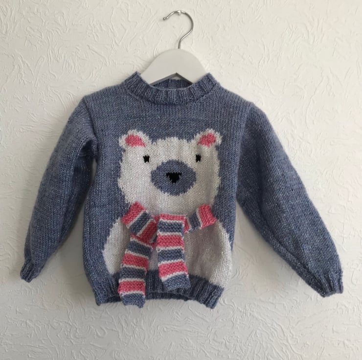 This appealing, round neck jumper is hand knitted in a glittery yarn. The main part is worked in a bluebell colour and it features a white polar bear on the front with a pink, blue and white scarf to tie round it's neck.
