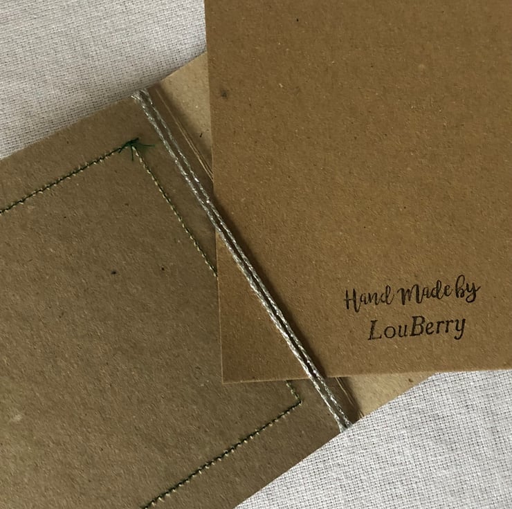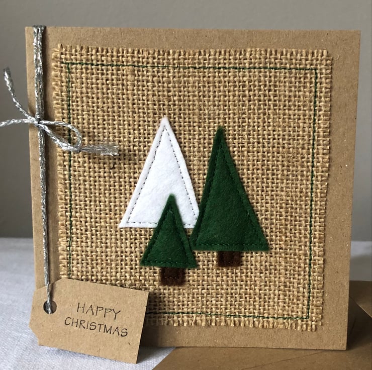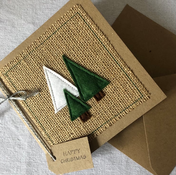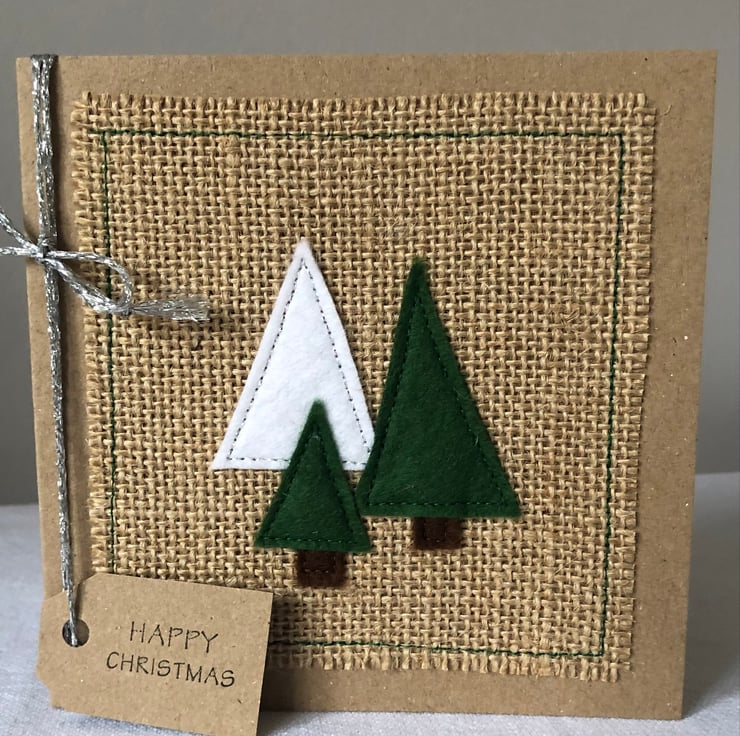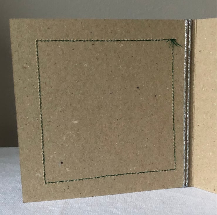 The hessian is machine stitched using a contrasting thread, onto a plain brown recycled card. This stitching is visible on the inside of the card.