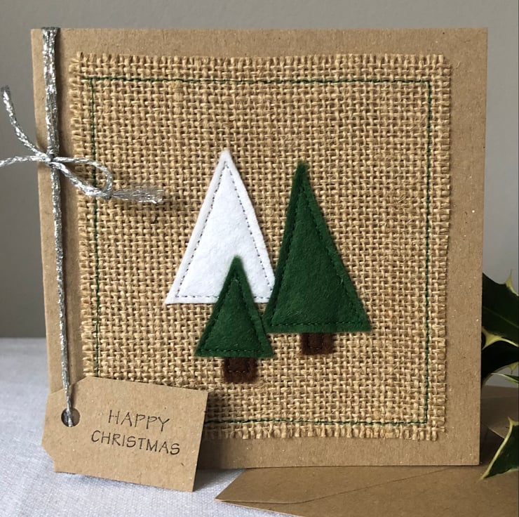 This card is decorated with festive trees in dark green and white, with some added sparkle.