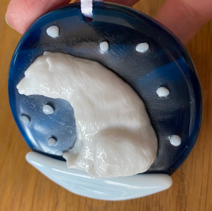 This handmade decoration has been fired three times in a specialist kiln to create this winter polar bear scene. The bear is made using powdered glass and tac fused to a pre-fired midnight blue base, with the snow embellishments. A hole has been drilled and it is hung on white satin ribbon.
