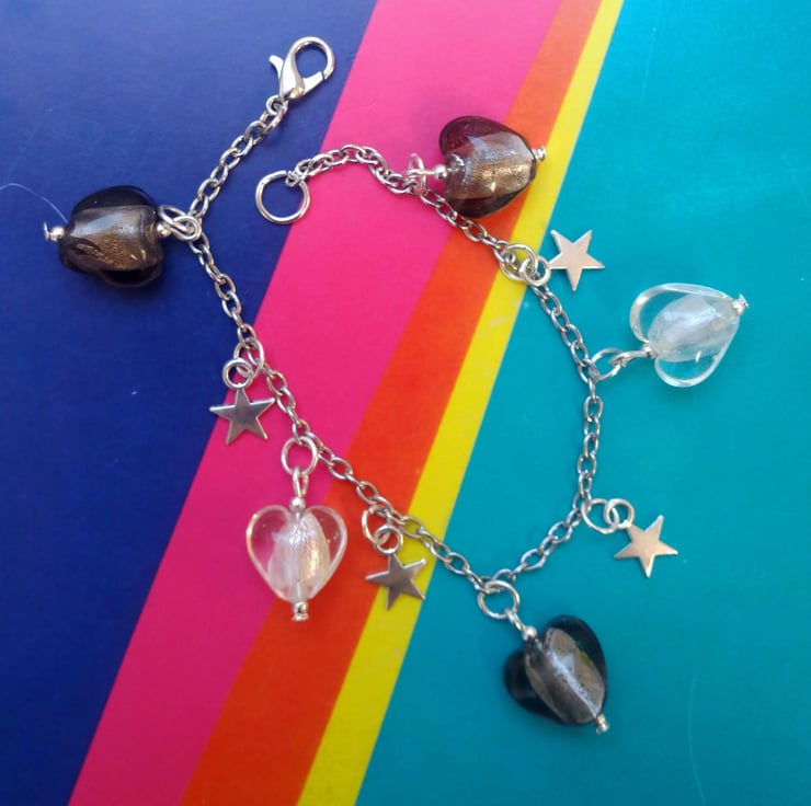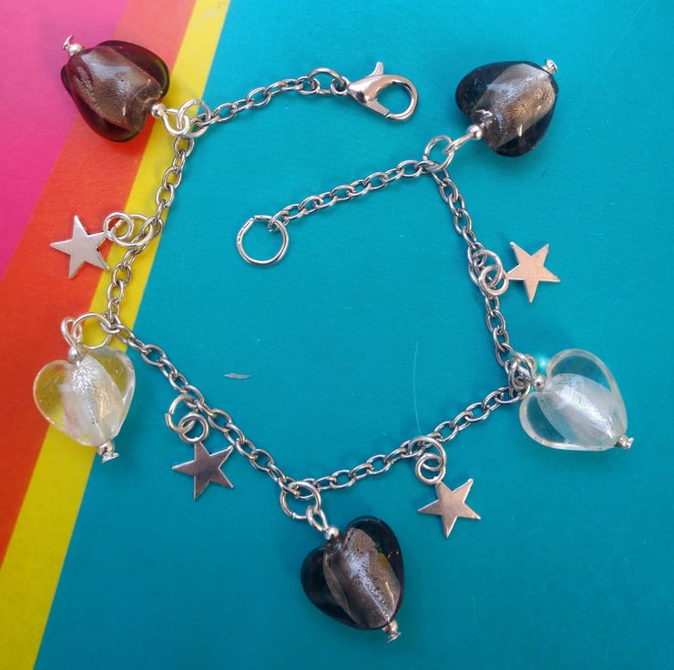 A lovely starry bracelet on a sterling silver chain with a lobster catch. With tiny Tibetan silver stars and glass hearts in shimmery grey and cloudy white. Simple and unique.