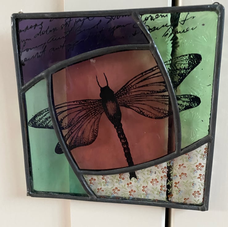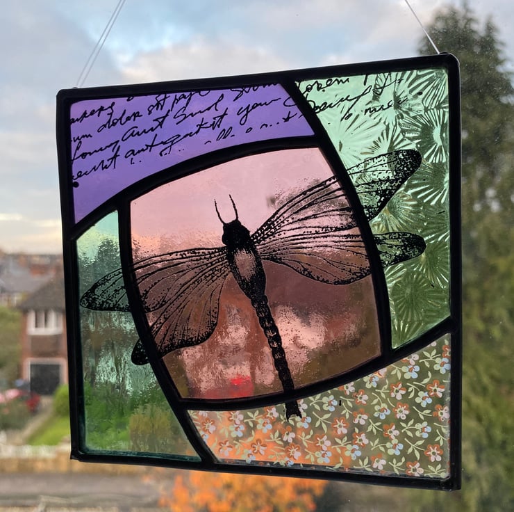 A beautiful 5 piece panel made using the Tiffany (copper foiled) method of stained glass. The panel is comprised of 5 pieces of glass in pale teal, lilac, purple,pale green and a patterned flowery glass. It has a dragonfly and text screen printed in black enamel before firing in the kiln. The lead came edge has been patinated to give a black antique finish, and it has a clear nylon hanging thread.